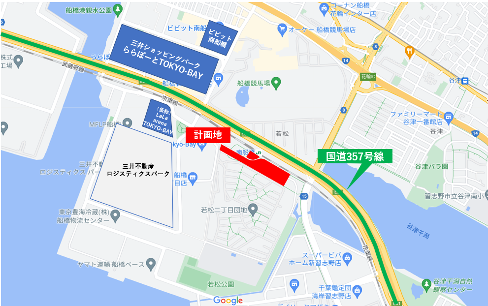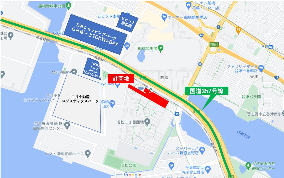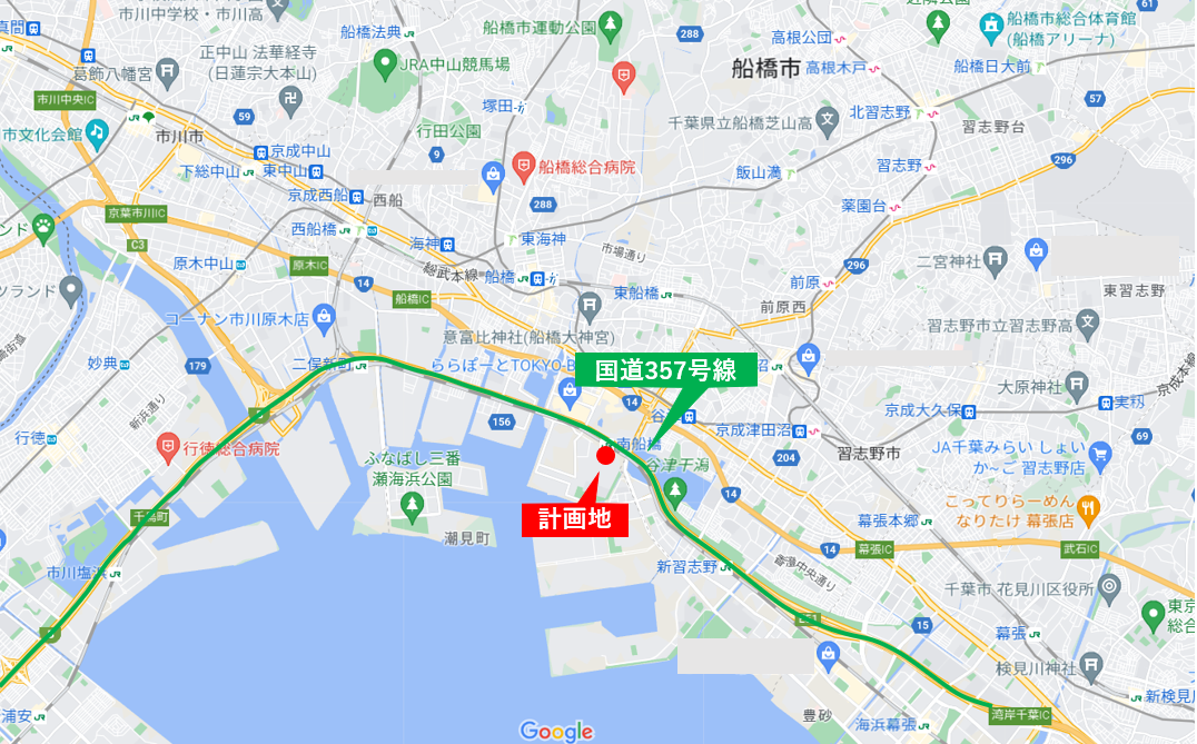 本計画地はJR京葉線・武蔵野線「南船橋」駅前の利便性の高い立地で、JR京葉線、JR武蔵野線、京成電鉄(「船橋競馬場」駅)の2駅3路線が利用可能です。