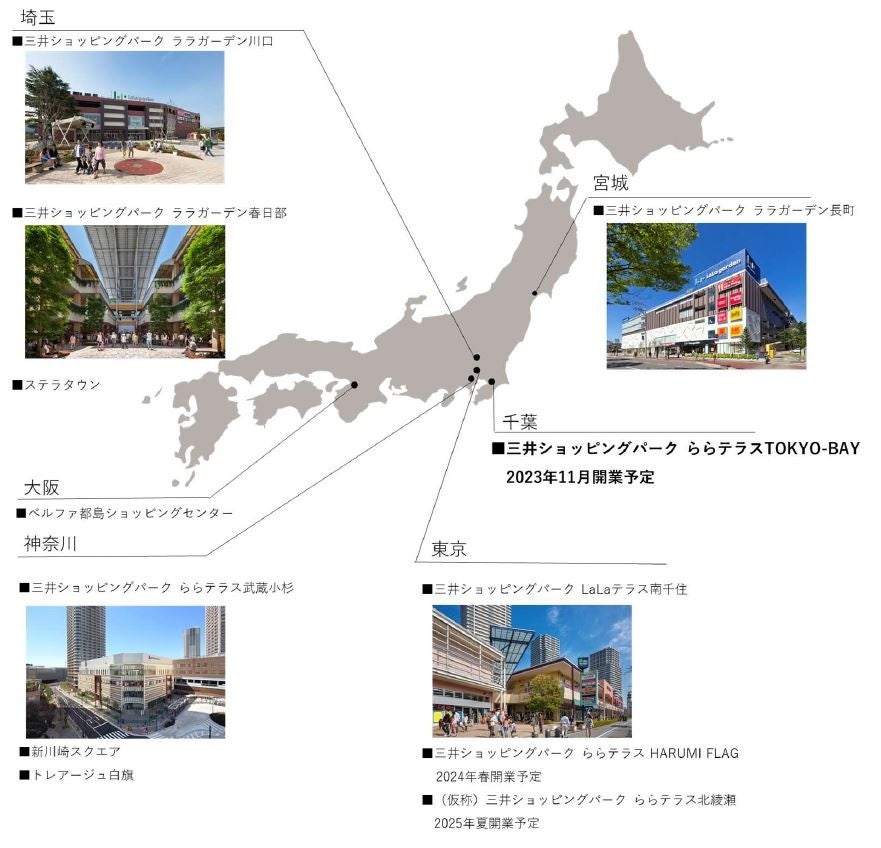 現在、「三井ショッピングパーク LaLaテラス南千住」(東京都荒川区、2004年開業)、「三井ショッピングパーク ららテラス武蔵小杉」(神奈川県川崎市、2014年開業)を運営しているほか、「三井ショッピングパーク ららテラス HARUMI FLAG」(東京都中央区、2024年春開業予定)、「(仮称)三井ショッピングパーク ららテラス北綾瀬」(東京都足立区、2025年夏開業予定)の開発を推進中です。