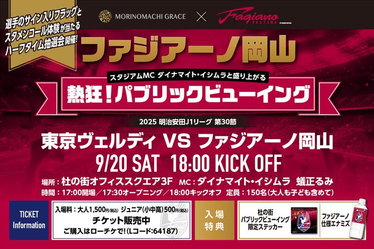この度、ファジアーノ岡山との共催で、2025年9月20日(土)にアウェイで開催される東京ヴェルディ戦に合わせて、杜の街グレース(商業施設|運営:両備ホールディングス株式会社、所在地:岡山市北区下石井二丁目10番8号| https://www.morinomachi-grace.jp/ )で「スタジアムMC ダイナマイト・イシムラと盛り上がる 熱狂!パブリックビューイング」を開催いたしますのでお知らせします。杜の街グレースを会場にしたパブリックビューイングは初開催となります。