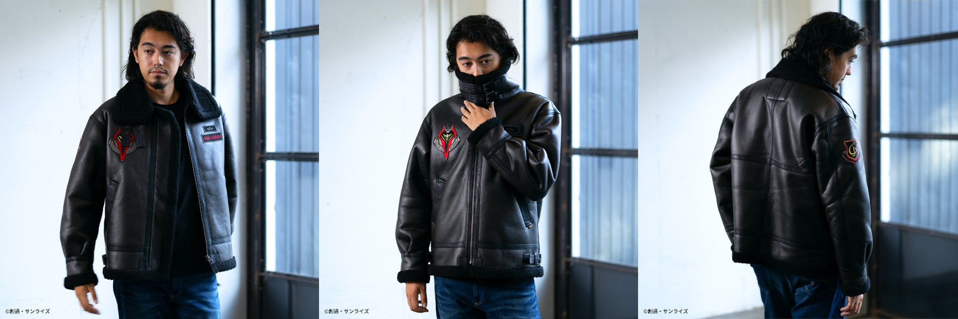 本コラボでは、『機動戦士ガンダム 逆襲のシャア』よりシャア着用モデルをイメージした、ブラウンの素材をベースにブラックに加工を施した深い味わいのあるカラーリング。裏面にはブラックのボアを使用した落ち着いた配色。左胸にCHAR AZNABLEの文字の刺繍ワッペン、右胸にはサザビーの盾をモチーフとしたワッペン、左袖にはキャスバル・ダイクンの刺繍ワッペンを配置したモデル。