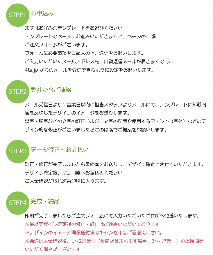 メール受信日より2営業日以内に担当スタッフよりメールにて、テンプレートに記載内容を反映したデザインのイメージをお送りします。