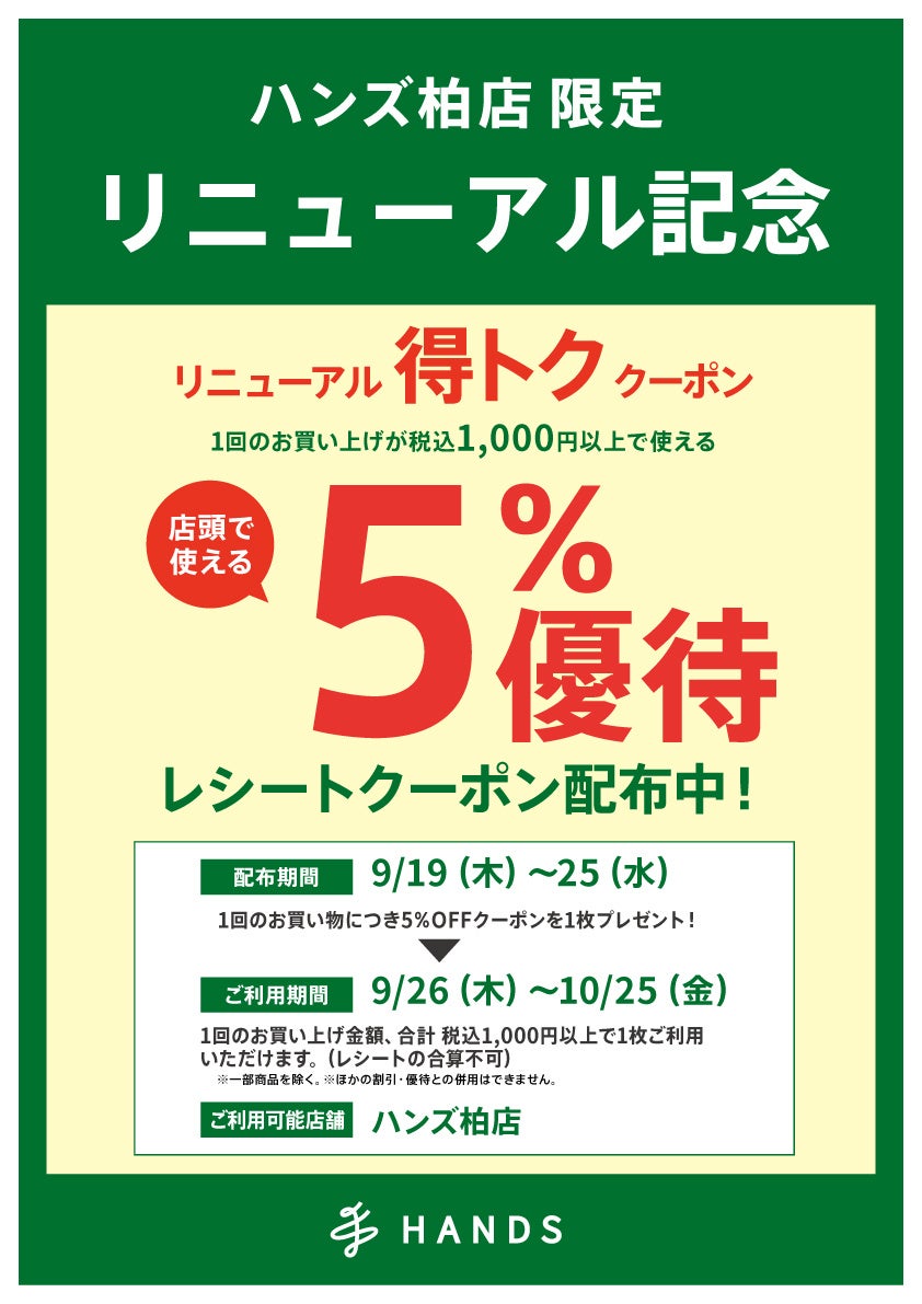 リニューアルオープンを記念して、ハンズ柏店でお買い上げいただきましたお客様へ5%OFFクーポンを配布します。