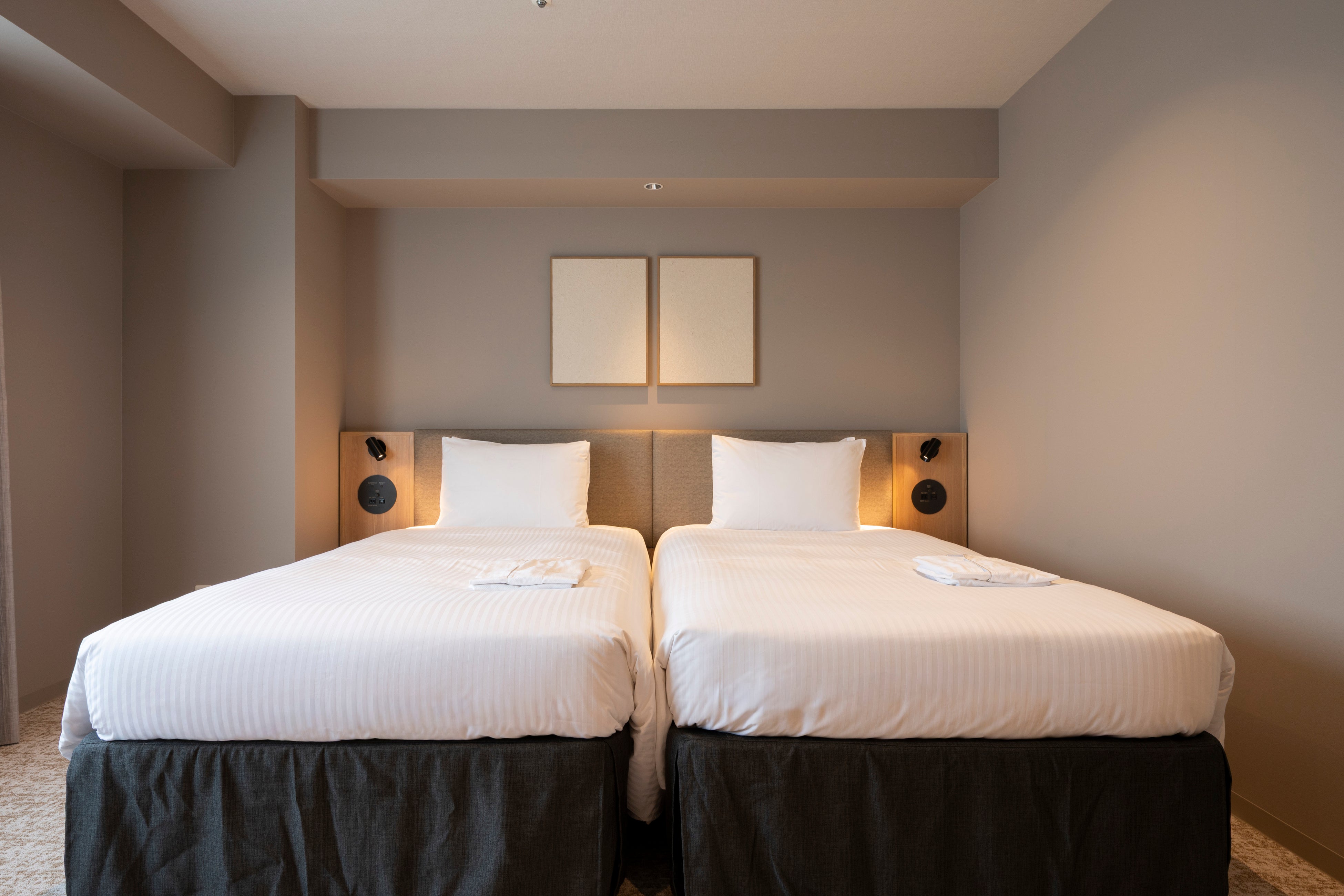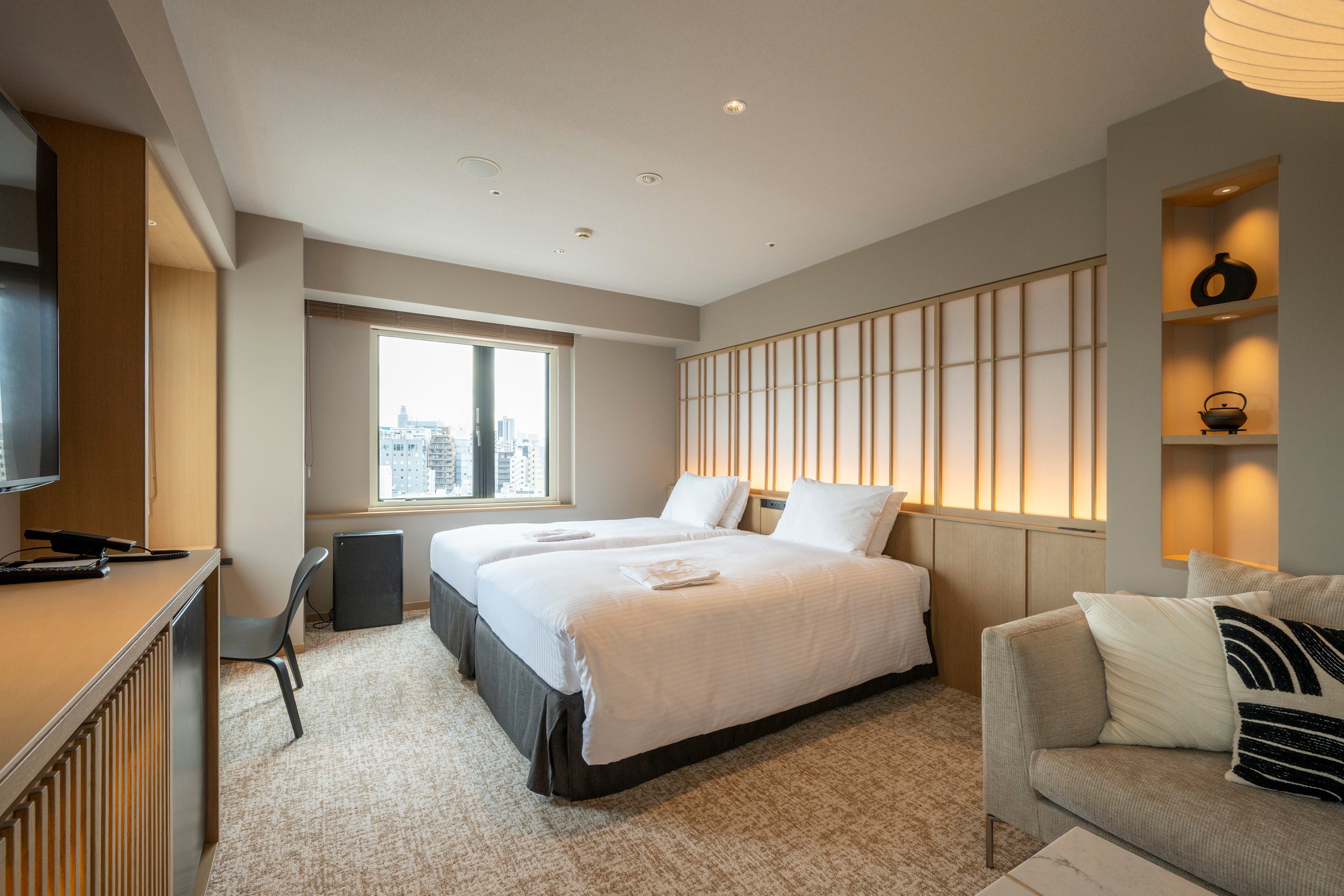 ダブルルーム2室を連結しゆとりある広さを備えたツインルームを新設いたしました。北欧のミニマルさと日本の静謐さを融合させた「ジャパンディ」をベースに空間デザインを構成しています。ダウンライトに照らされた廊下から少し奥まったアプローチが、非日常の静寂な空間へと誘います。客室入口には玄関スペースからカーペットへと続く床仕上げの切り替えを設け、靴を脱いで過ごせるスタイルを採用。バブルペンダントは、日本の繊細な職人のクラフトマンシップにも通じる柔らかなフォルムと緻密なディテールを持ち、世界観を象徴するインテリアとして設置いたしました。ペンダント下にはデンマークの名門eilersen(アイラーセン)社のソファーを配置し、北欧の静かな上質さを空間に添えています。日本古来のデザインともいえる格子と障子をイメージしたベッドボードには優しい光が映し出され、リラックスできる空間を作りだします。TV下には急須や茶器、お茶菓子をご用意し、工芸品に触れお茶を愉しむ体験をご提供いたします。7階以上のプレシャスコンフォートツインからは浅草寺と五重塔、東京スカイツリー®を望む浅草の借景を楽しめる特別な客室となっております。