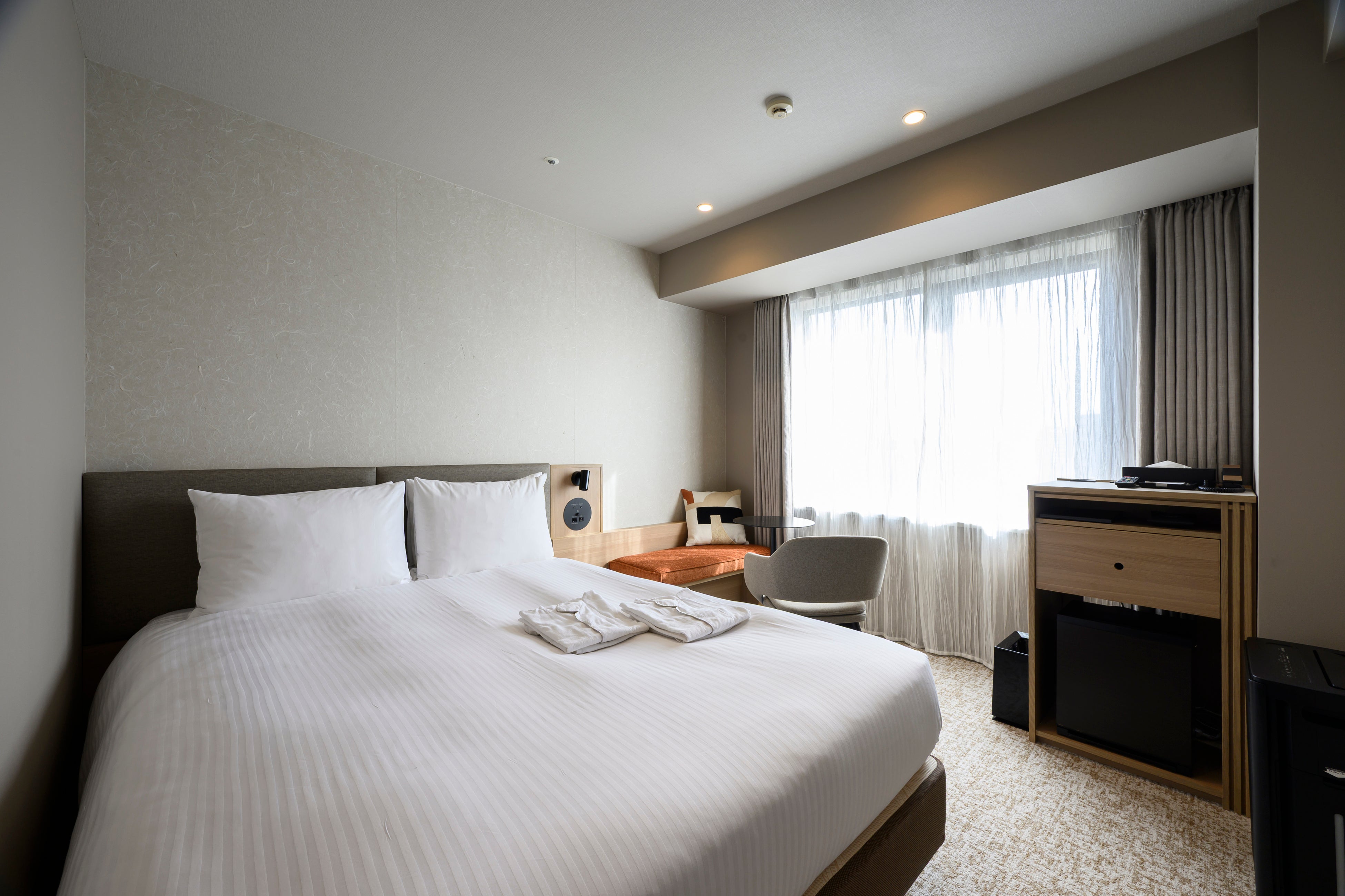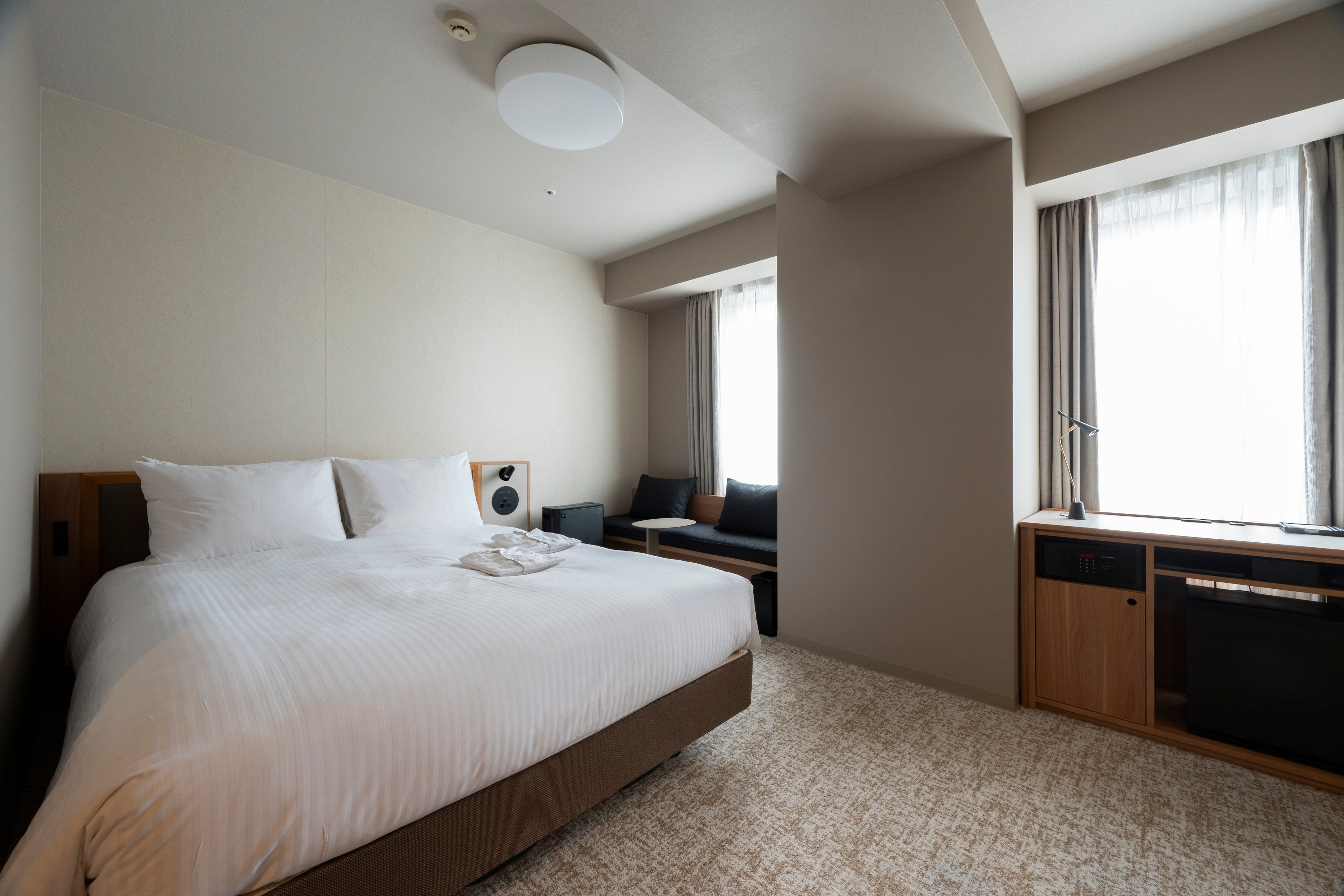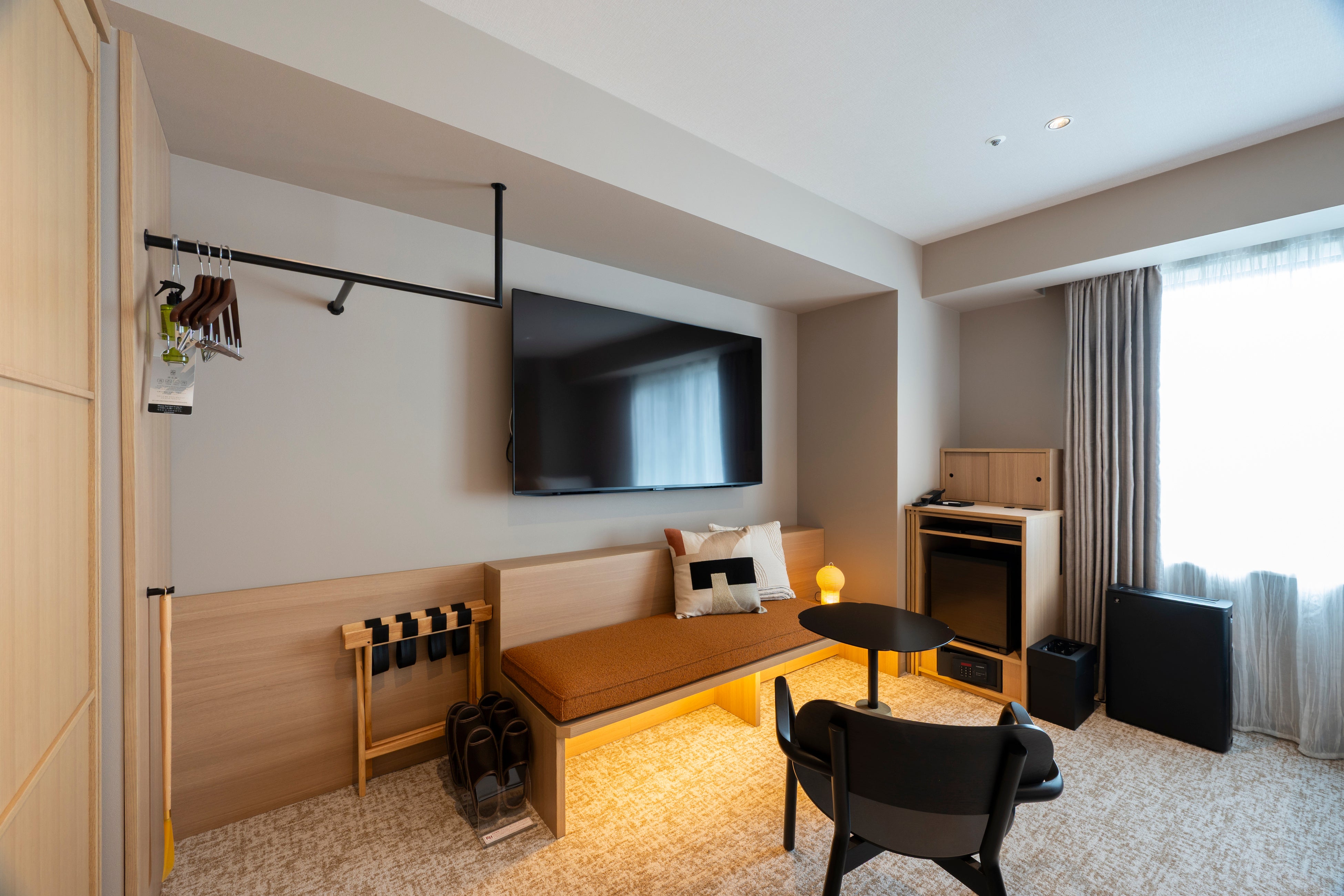 客室は北欧風のオーク材を基調とした設えの中に、和紙を用いた壁紙やアート、黒をアクセントにしたチェアやファブリックを組み合わせ、「和」と「北欧」が調和した洗練された空間に仕上げました。すべての客室のベッドボードにはコンセントやUSBポートを設置し、利便性を向上いたしました。さらにデスクを撤去しソファーやベンチを新設。収納スペースを確保し、より広く快適にお過ごしいただけるよう工夫いたしました。ベッドにはシモンズ社製のベッドマットレスを使用し、上質な睡眠環境を整えました。