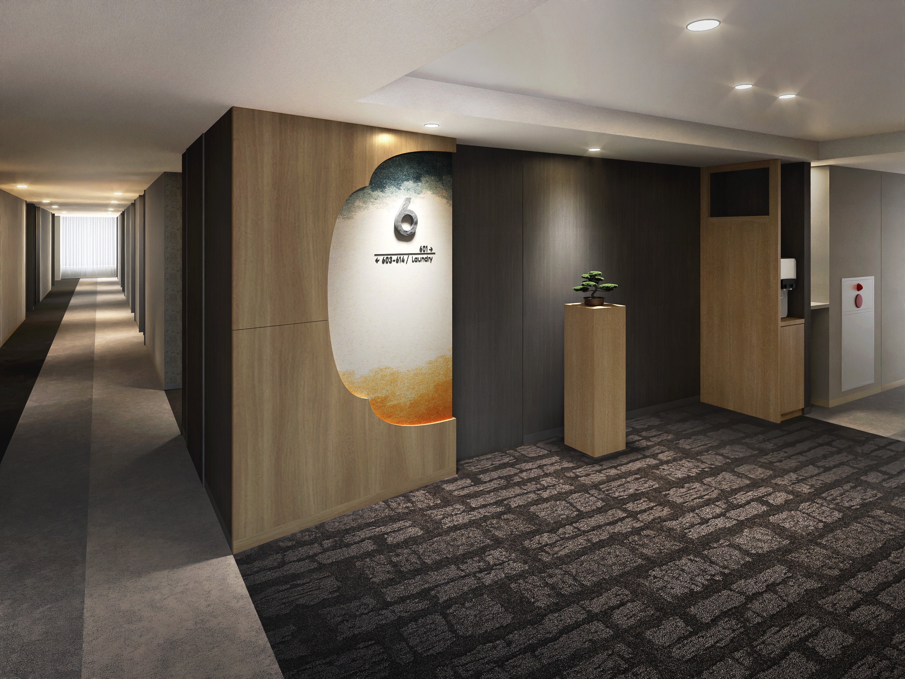 ロビーで用いた小松石を階数表示に採用し、素材の連続性を演出。背景にはロビー絵画でも描かれている摺(すり)の技術の一つ、にじみやかすれを利用して一文字だけを淡く滲ませる「一文字ぼかし(いちもんじぼかし)」を取り入れ浅草の“今と昔”が重なるデザインとなっております。床には石畳を想起させるカーペットを敷き、浅草の路地の記憶を動線の中に溶け込ませています。
