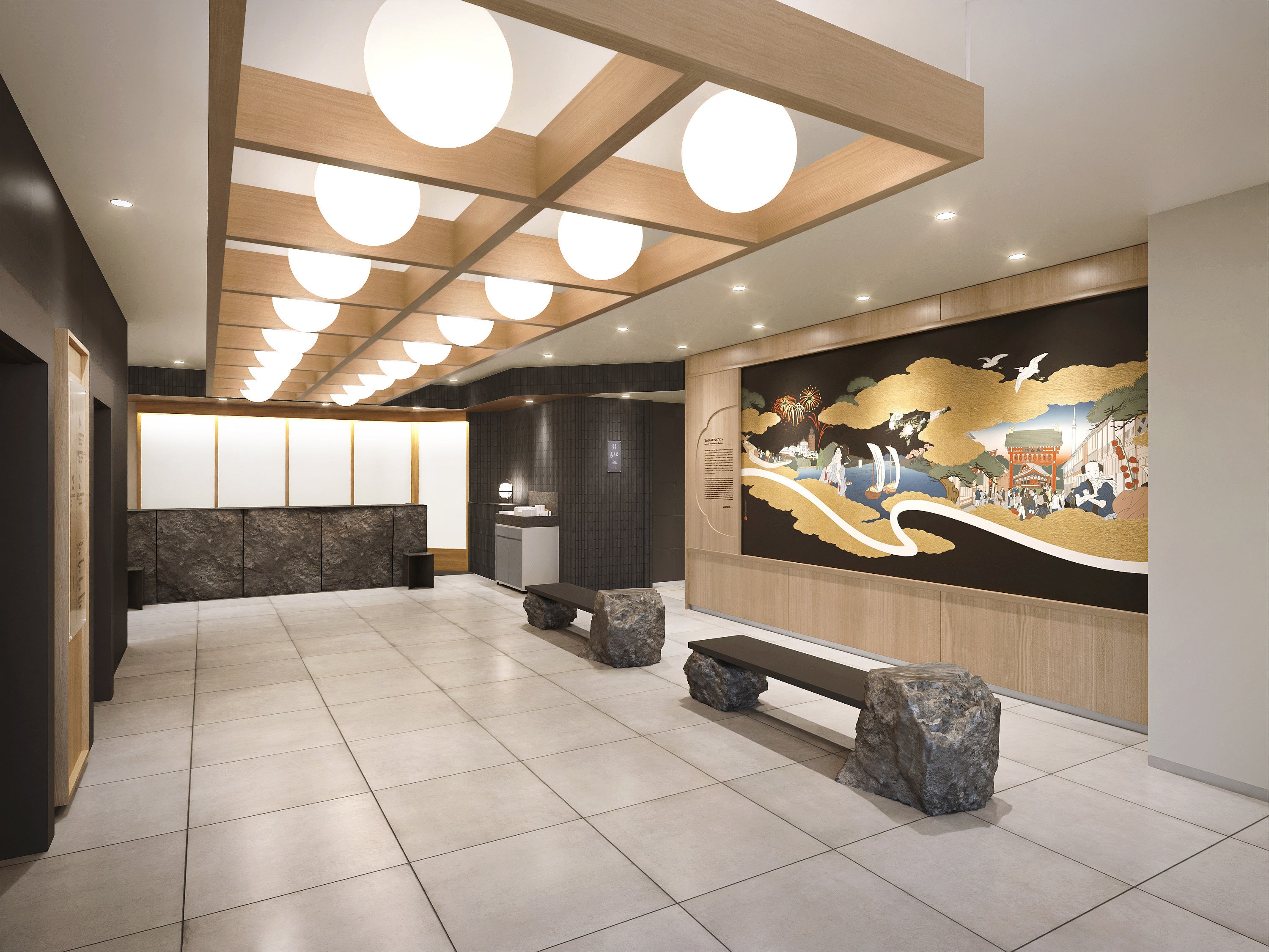 ロビーは浅草の“今と昔”を重ね合わせた「OZ-尾頭-山口佳祐氏」の絵画を中心に構成。天井には浅草の灯り文化から着想した提灯格子を施しました。素材には、浅草寺にも使われる小松石と黒皮風仕上げの素材を採用。床はモルタル風タイルで仕上げ、江戸の風合いと現代性が交差する浅草らしい世界観を演出し、上質で落ち着いた空間でお客さまをお迎えします。