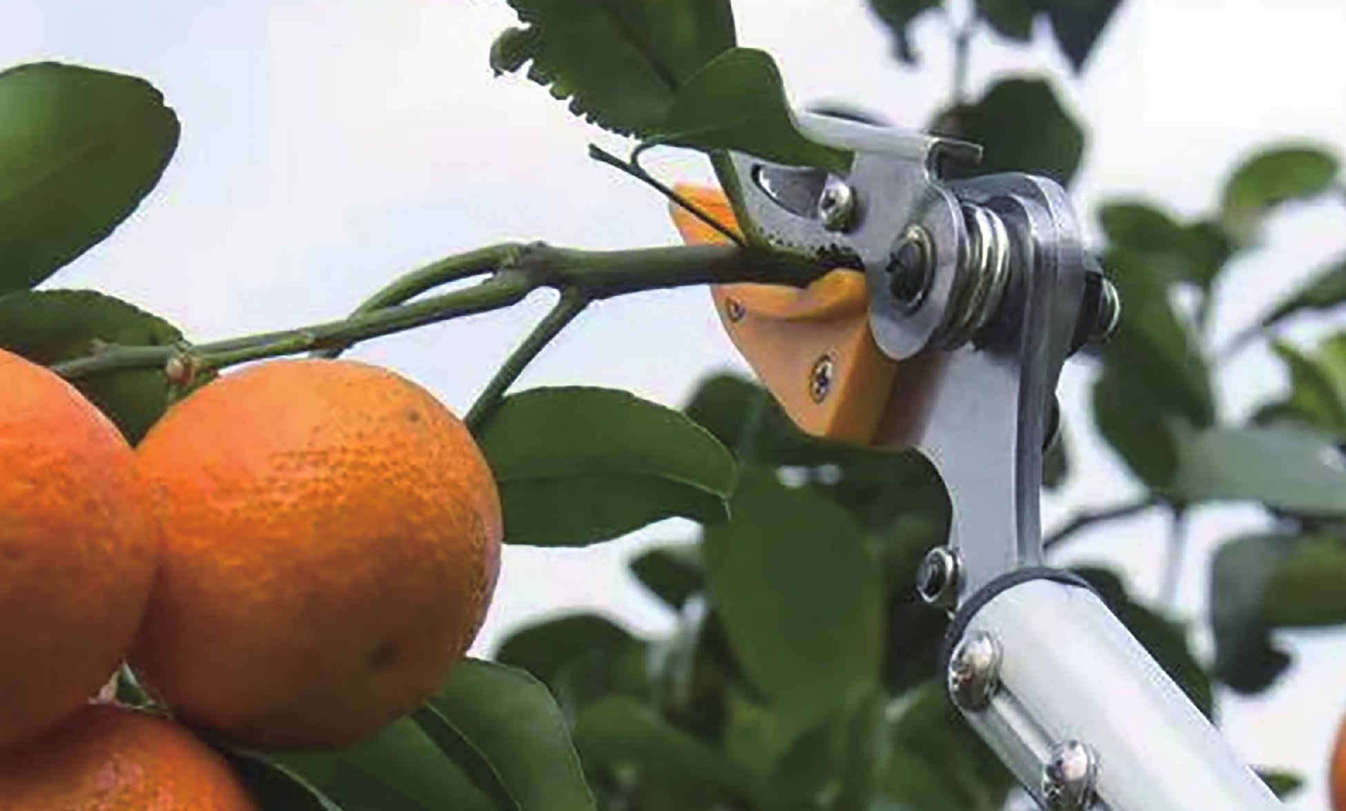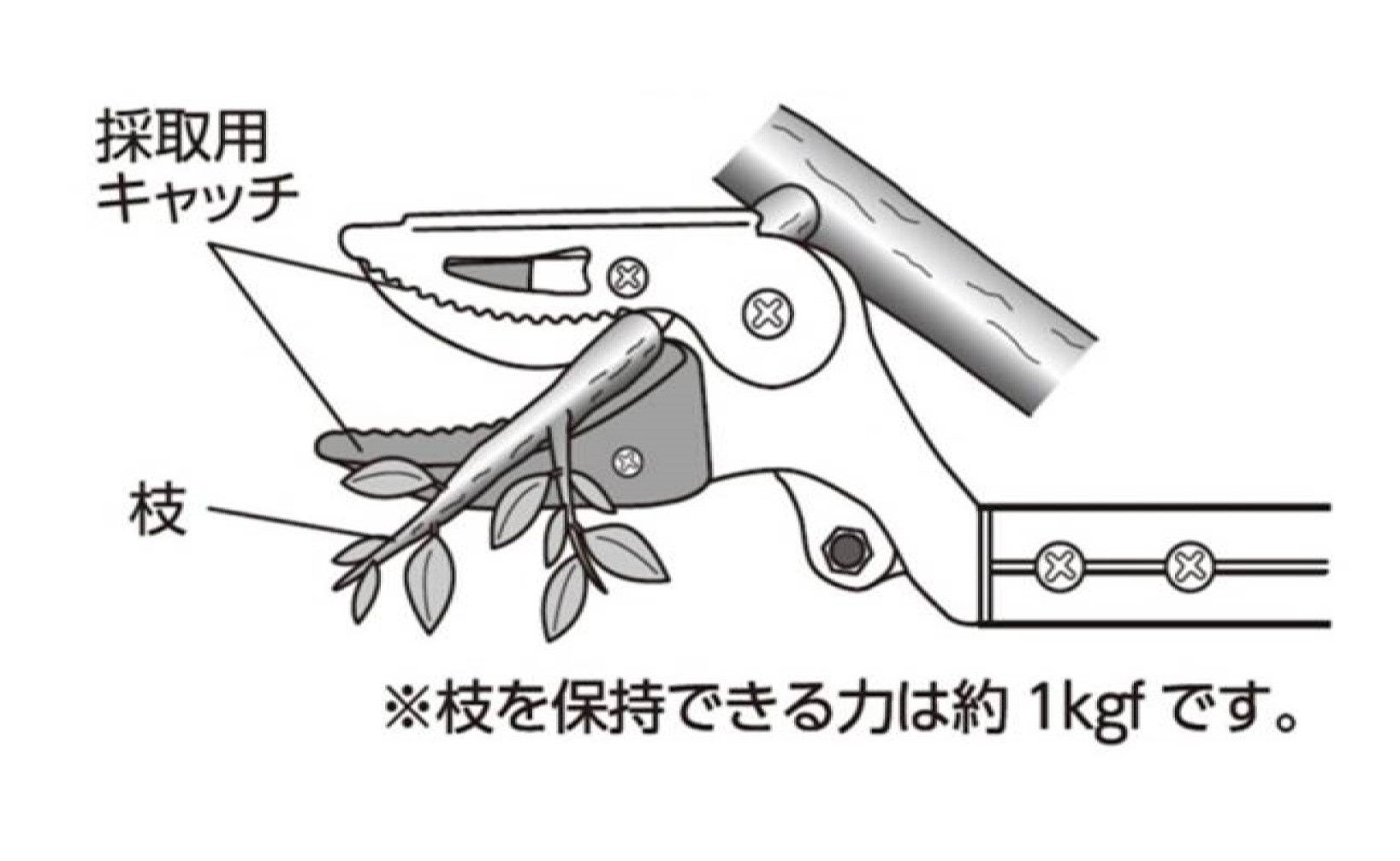 刃先には採取用キャッチがついており、カットした枝や果実を落としません。このキャッチ機能は、作業後の片づけの効率化や、果実の収穫、敷地外にはみ出した枝のカットなど、さまざまな場面で活躍します。