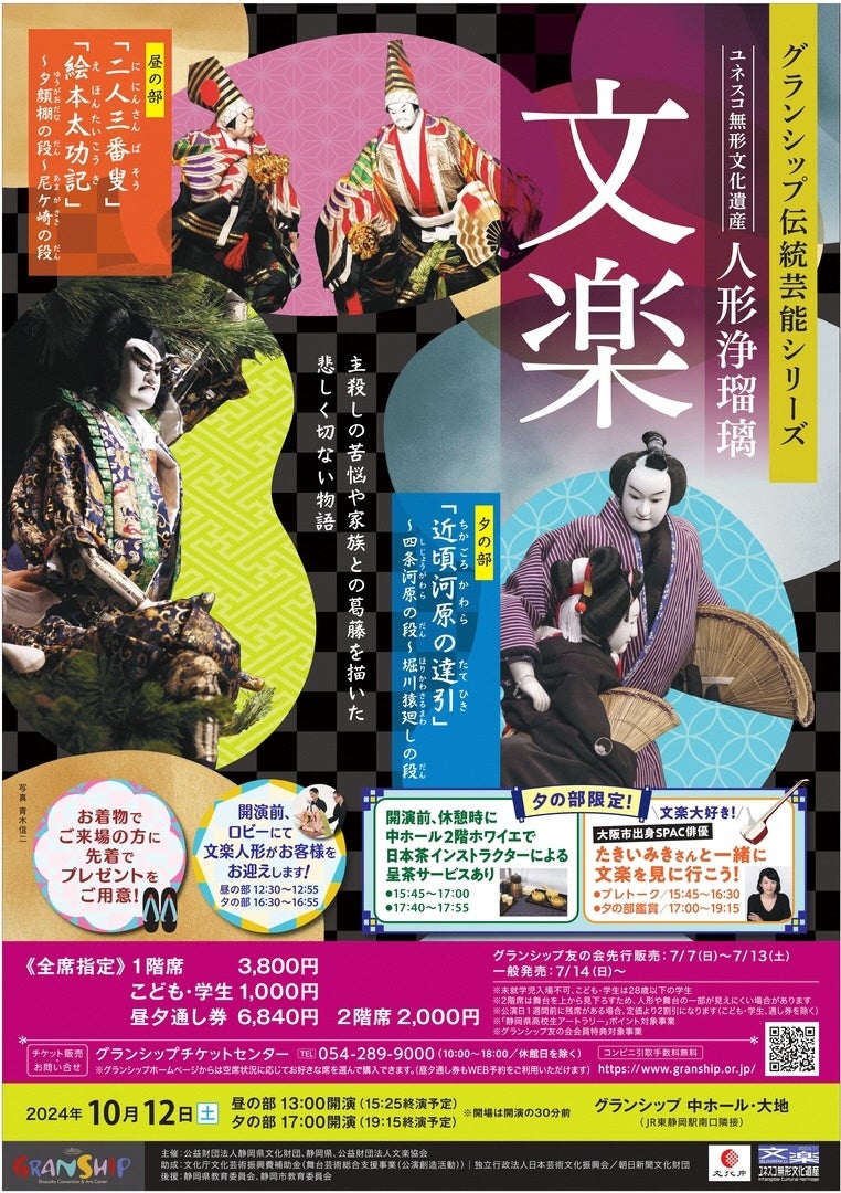 公益財団法人静岡県文化財団・グランシップでは、ユネスコ無形文化遺産である「人形浄瑠璃 文楽」の公演を開催します。