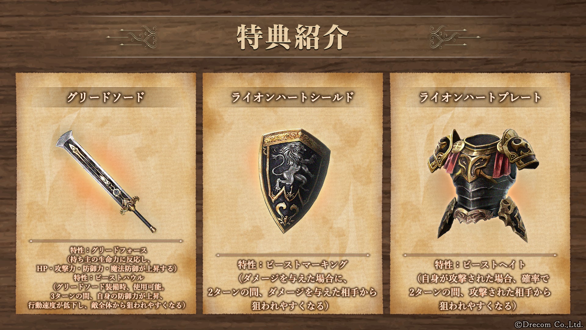 特性:ビーストハウル(グリードソード装備時、使用可能。3ターンの間、自身の防御力が上昇、行動速度が低下し、敵全体から狙われやすくなる)