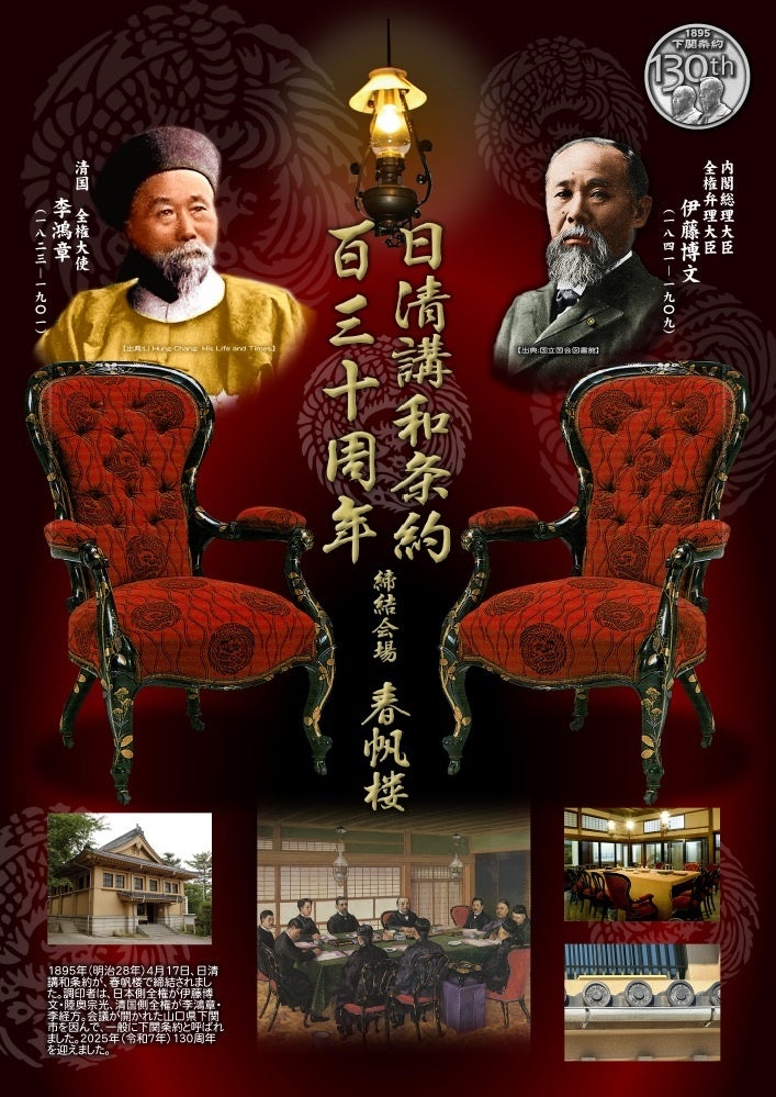 1895年3月19日、百名を超える清国使節団を乗せた船が亀山八幡宮沖に到着。日本側からは伊藤博文と陸奥宗光が全権弁理大臣として、清国側からは李鴻章が講和全権大臣として、両国代表合わせて11名が会議に臨みました。講和会議は、当時の春帆楼二階大広間を会場に繰り返し開催され、同年4月17日に日清講和条約(下関条約)が締結されることとなります。