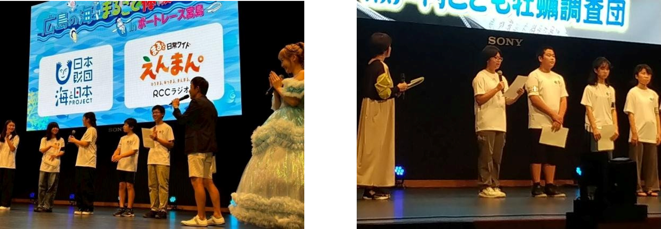 「瀬戸内こども牡蠣調査団」の中学生団員11名は会場内のイベントホールで、RCCラジオの人気番組「まるっと日常ワイド えんまん。」の公開収録イベントに特別出演、江田島で牡蠣を通して何を学んだかを説明した後、学びの成果を同世代やより年下の年代へ伝えるための「教材」を作っていることを説明、およそ550名の観客が見守る中、学んだことを基に「牡蠣の知られざる秘密」についてクイズを出題しました。「牡蠣はオスになったりメスになったりする〇か✖か?」とか「牡蠣は地球温暖化を防ぐことに貢献している〇か✖か?」など、地元の名産の意外に知られていないことを番組パーソナリティやゲストを交えて、会場が一体となって楽しく学びました。