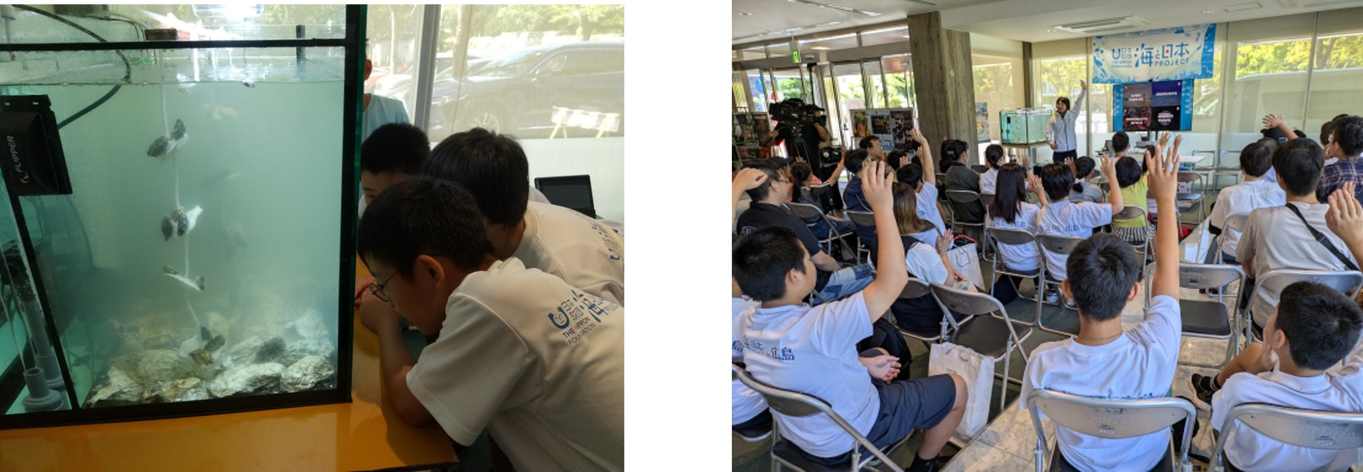 夏の江田島での学びを基に、中国放送(広島市中区基町)本社ロビーに牡蠣を飼育観察する水槽を設置。6カ月の飼育期間を通して、牡蠣の成育過程を見て学ぶとともに「餌の多い少ない」「牡蠣の密度」などの要素で水槽内の牡蠣の成育にどんな影響がでるか仮説を立て、観察・考察しました。
