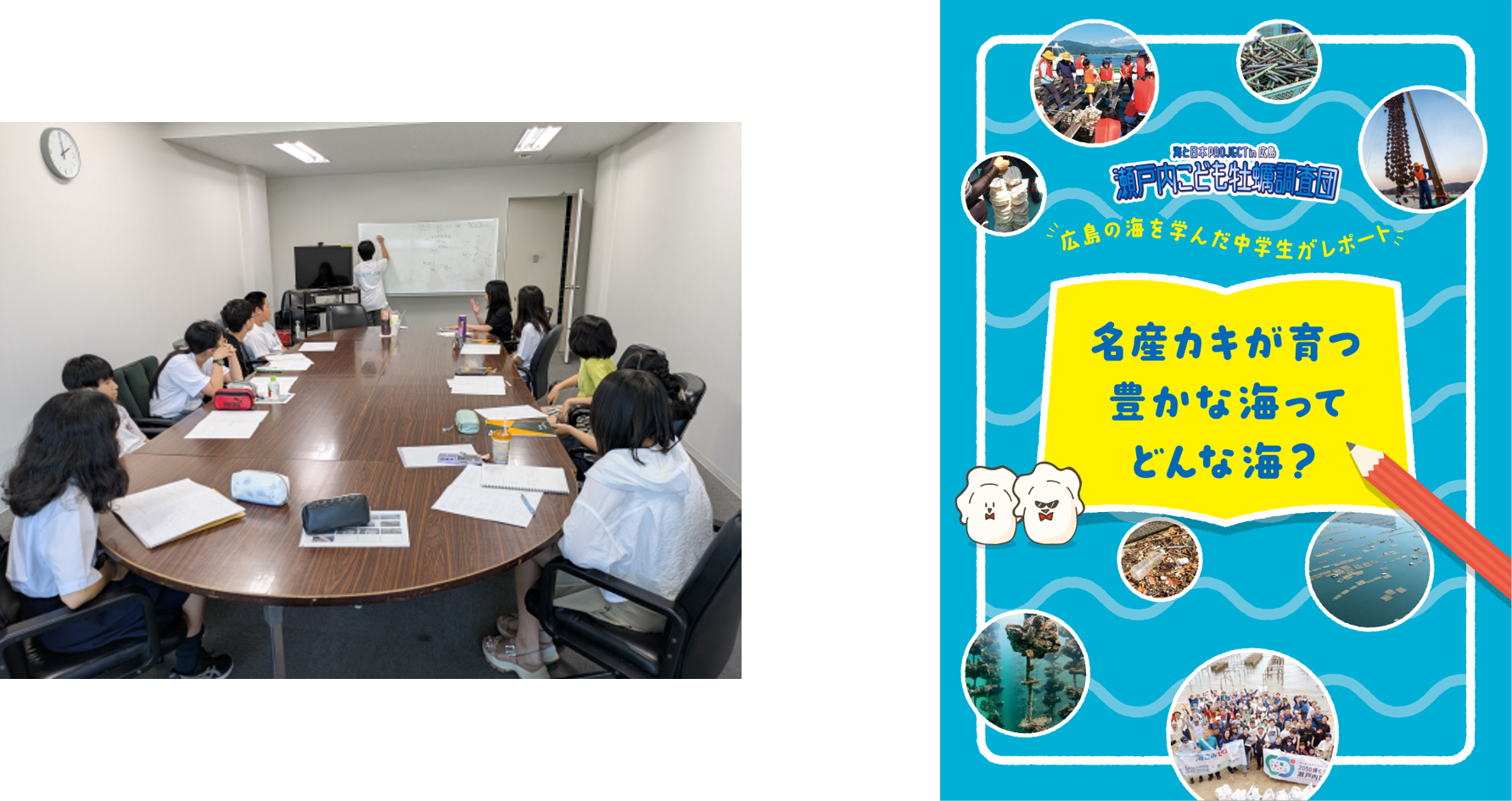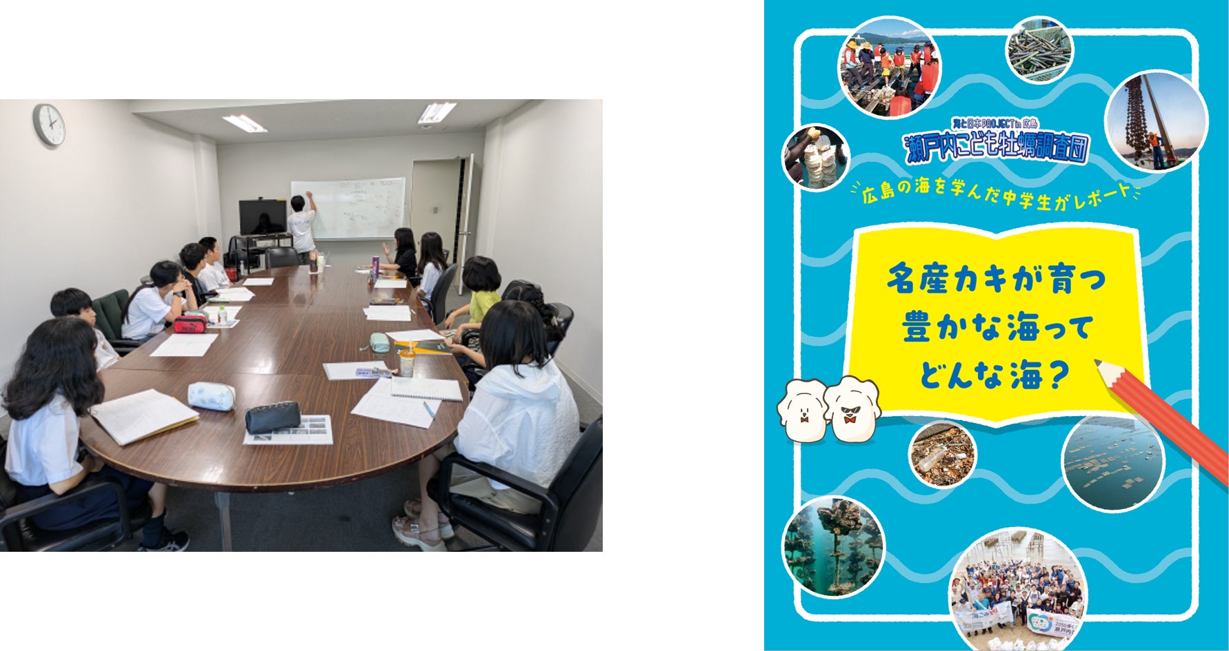 一般社団法人瀬戸内プロジェクトin広島は、7月の「江田島」現地調査、9月~の牡蠣水槽飼育観察など、牡蠣を通して広島の海を学んできた「瀬戸内こども牡蠣調査団」の中学生11名が制作したテキスト『名産カキが育つ豊かな海ってどんな海?』を完成、発表します。