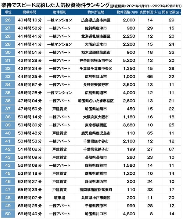 掲載期間中に問い合わせ(WEB上の資料請求)が10件以上あり、「楽待経由での成約」を理由に掲載終了となった人気物件を、掲載時間の短い順にランキングしたもの(調査期間:2021年1月1日~2023年12月31日)です。
