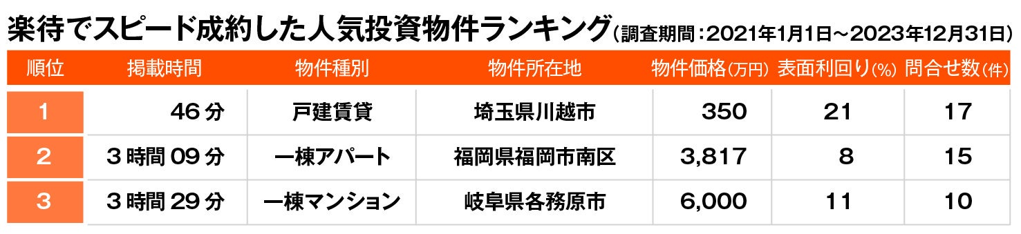 「楽待でスピード成約した人気投資物件ランキング」とは