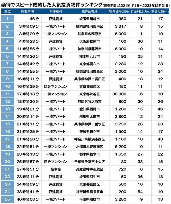 ・調査方法:調査期間中に楽待に掲載され、掲載終了の理由として「楽待経由で成約」が選択された物件のうち、掲載期間中の問い合わせ(WEB上の資料請求)が10件以上あった物件を算出して、掲載時間の短い順にランキング