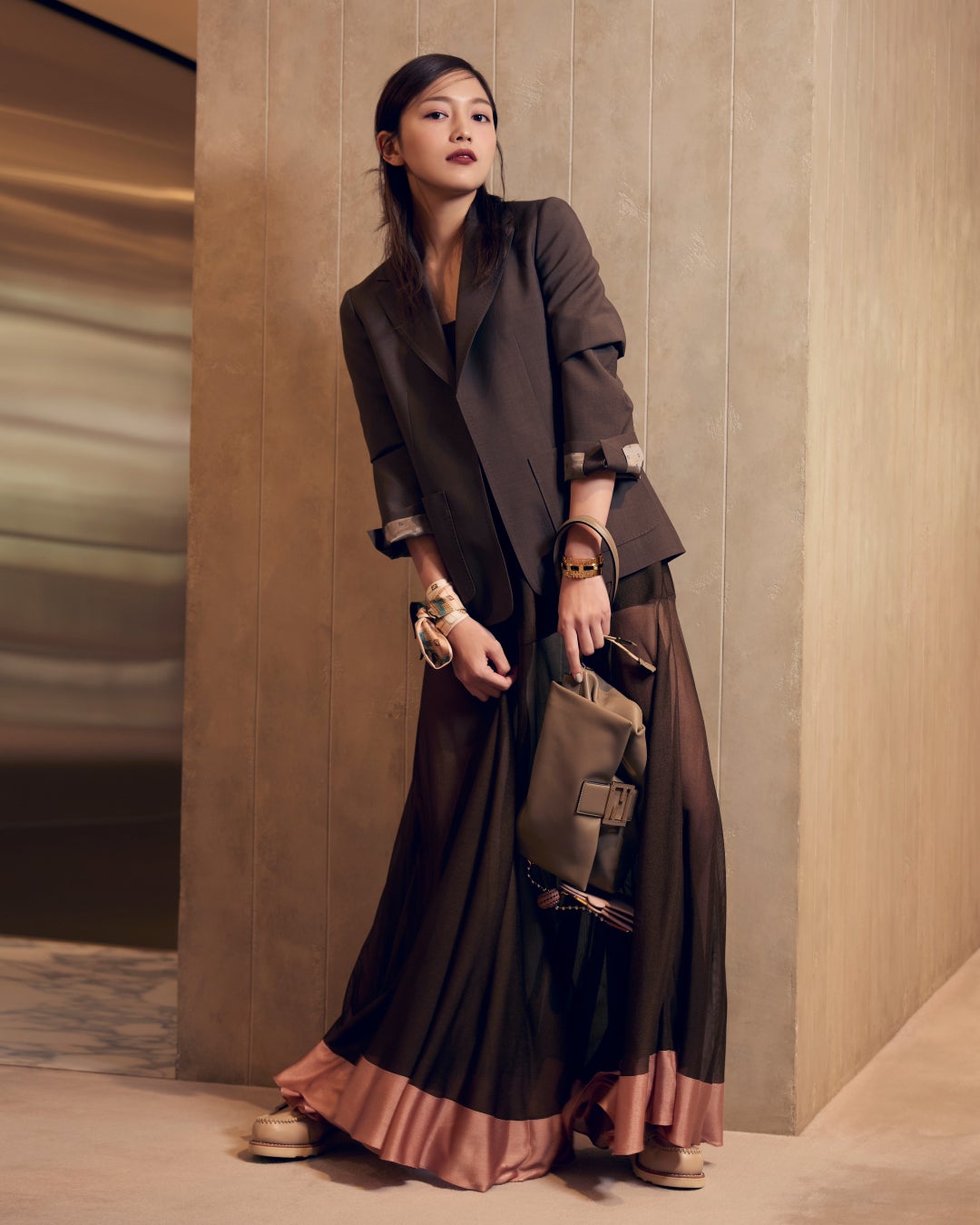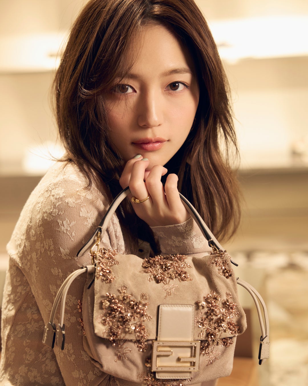 本編で川口春奈は「マンマ バゲット」に合わせ、魅力的な3つのスタイルを披露しています。1つ目は、ホワイトジャカードのフローラルモチーフが施されたロングドレスとスリップドレスを合わせたコーディネート。全面にスパンコールとビーズで刺繍が施された「マンマ バゲット」のスモールサイズを合わせ、フェミニンでエレガントなスタイルを完成させました。2つ目は、ピンストライプのシャツにフローラルブーケのモチーフが施されたシルクジャガードホワイトパンツを合わせたクラシカルな コーディネートに、足元にはアメリカのフットウェアブランド、「レッドウィング(Red Wing)」との共同制作による「フェンディ アンド レッドウィング(FENDI and RED WING)」ブーツを合わせ、ラグジュアリーでありながら軽やかで実用的なスタイルを披露しました。3つ目はマットブラウンのロングドレスにジャケットを合わせた、フェンディらしいミックス&マッチのスタイル。「マンマ バゲット」には、ボールチャームと日本限定で発売予定の「ピーカブー(Peekaboo)」型の「ピーカブー」カードケース を取り付け、遊び心のある彼女らしいチャーミングなバッグとともに様々なルックを楽しんでいる様子が収められています。
