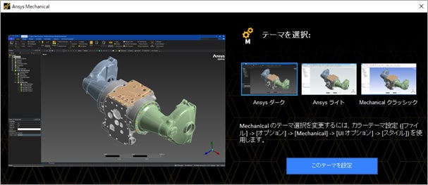 Ansysソフトウェアのルック&フィールが再定義され、すべてのAnsysアプリケーションを使った解析業務の生産性が向上しました。例えば、GUIには視認性を重視した「ライト」と、長時間利用時の目の疲れを軽減する「ダーク」の2つのテーマが新たに追加され、従来の「クラシック」を含む3つのテーマから選択することができます。