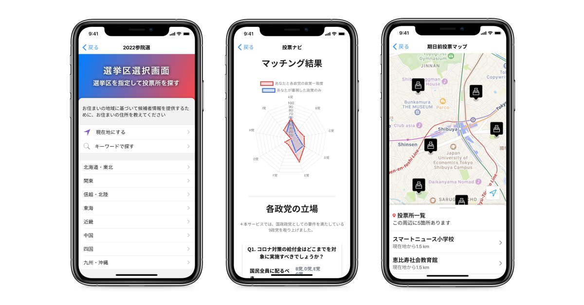 ~ 自分の意見に近い政党を探せる「投票ナビ」、選挙区ごとの「期日前投票マップ」、選挙区ごとの候補者一覧や関連ニュースなど、スマホアプリで投票率向上に貢献へ〜