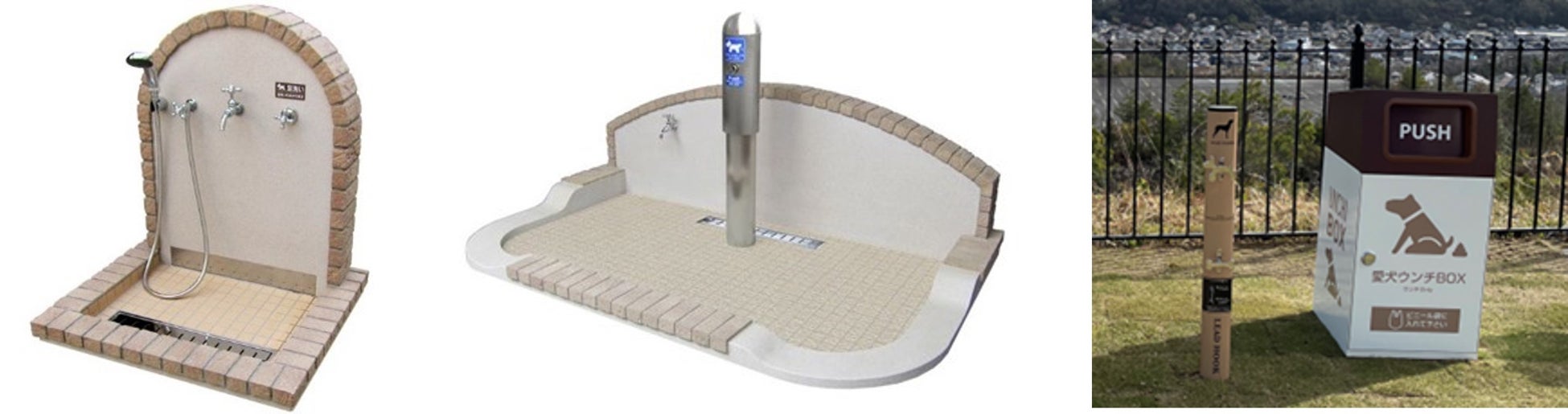 ●憩いの場エリア:ドッグシャワー(足洗い場) 1台、ドッグトイレ(水洗おしっこタイプ)1台、愛犬ウンチBOX1台 リードフックポール4台、パラソルベンチ2台