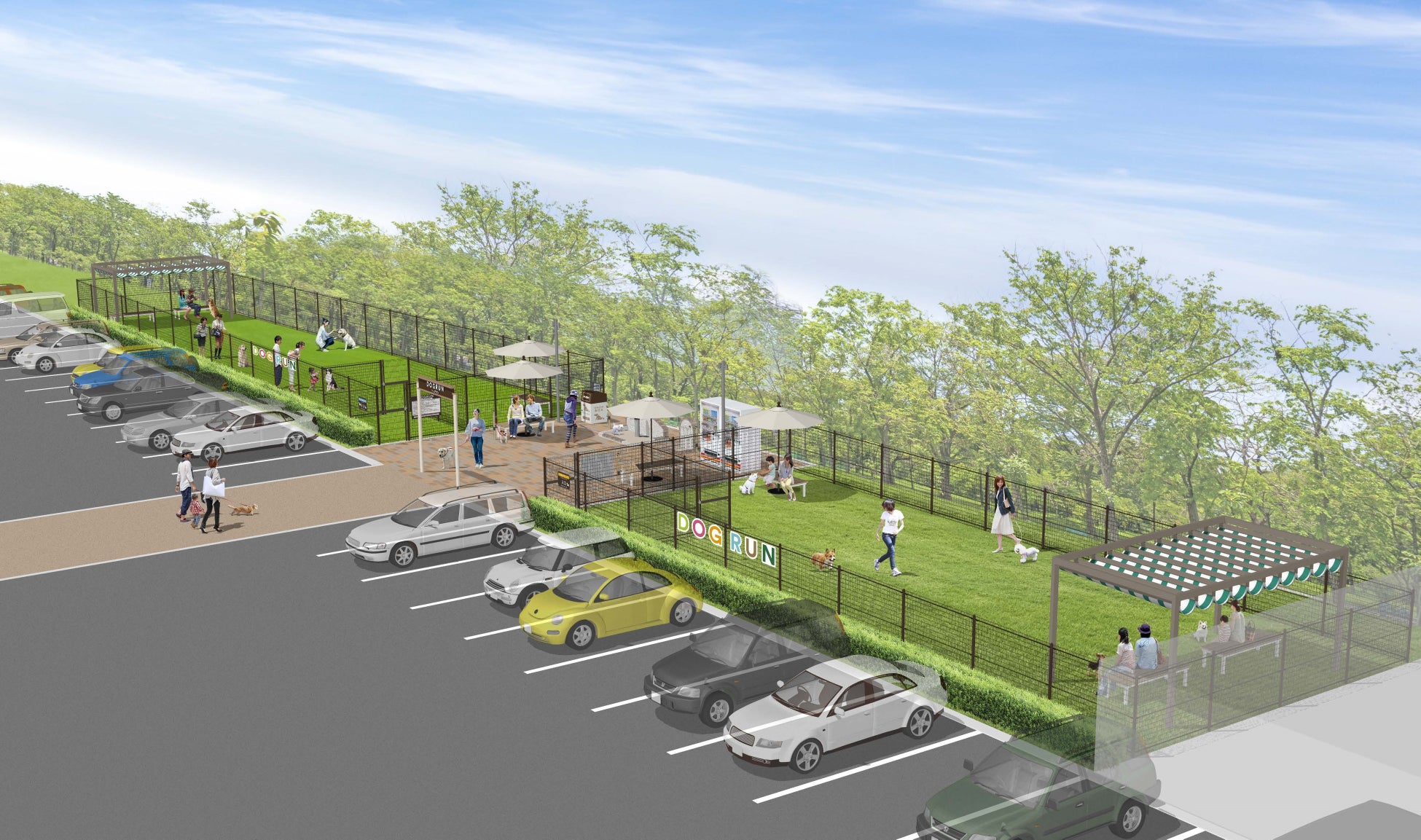 新設する屋外ドッグランは、総面積で約470㎡、小型犬エリアとフリーエリアの2エリアに分かれ、小型犬から大型犬まで無料でご利用いただけます。ドッグラン内にはパラソルやベンチを設置し、ゆっくりとくつろぎながらペットを見守ることができます。また、洗い場やトイレなども完備しており、たくさん遊んだ後には足を清潔にしてからお車に乗っていただくこともできます。