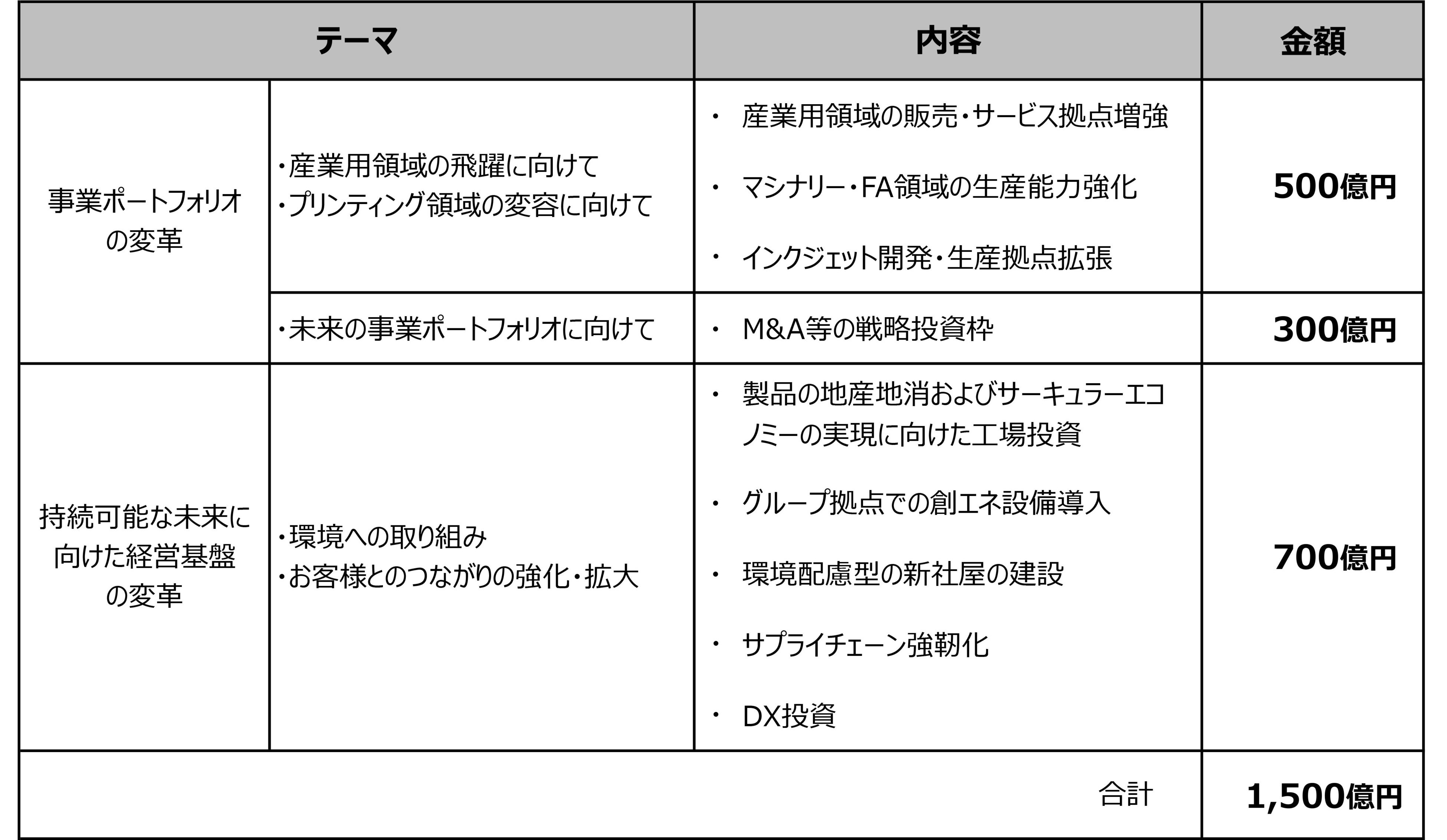 事業ポートフォリオの変革と、持続可能な未来に向けた経営基盤の変革実現に向けた先行投資枠として総額1,500億円が設定された。この投資枠を活用して、「事業ポートフォリオの変革」に向けては、産業用領域やインクジェット技術に関わる各種の機能、拠点の強化、M&A等の戦略投資を行っていく。また、「持続可能な未来に向けた経営基盤の変革」に向けては、環境への取り組みやサプライチェーンの強靭化などが進められる。