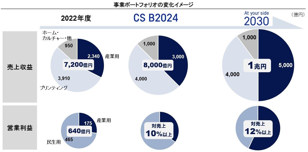 「CS B2024」では、「あたらしい未来へのテイクオフ」をテーマに、産業用領域の飛躍や、プリンティング領域の変容などの事業ポートフォリオの変革と、持続可能な未来に向けた経営基盤の変革を目指す。