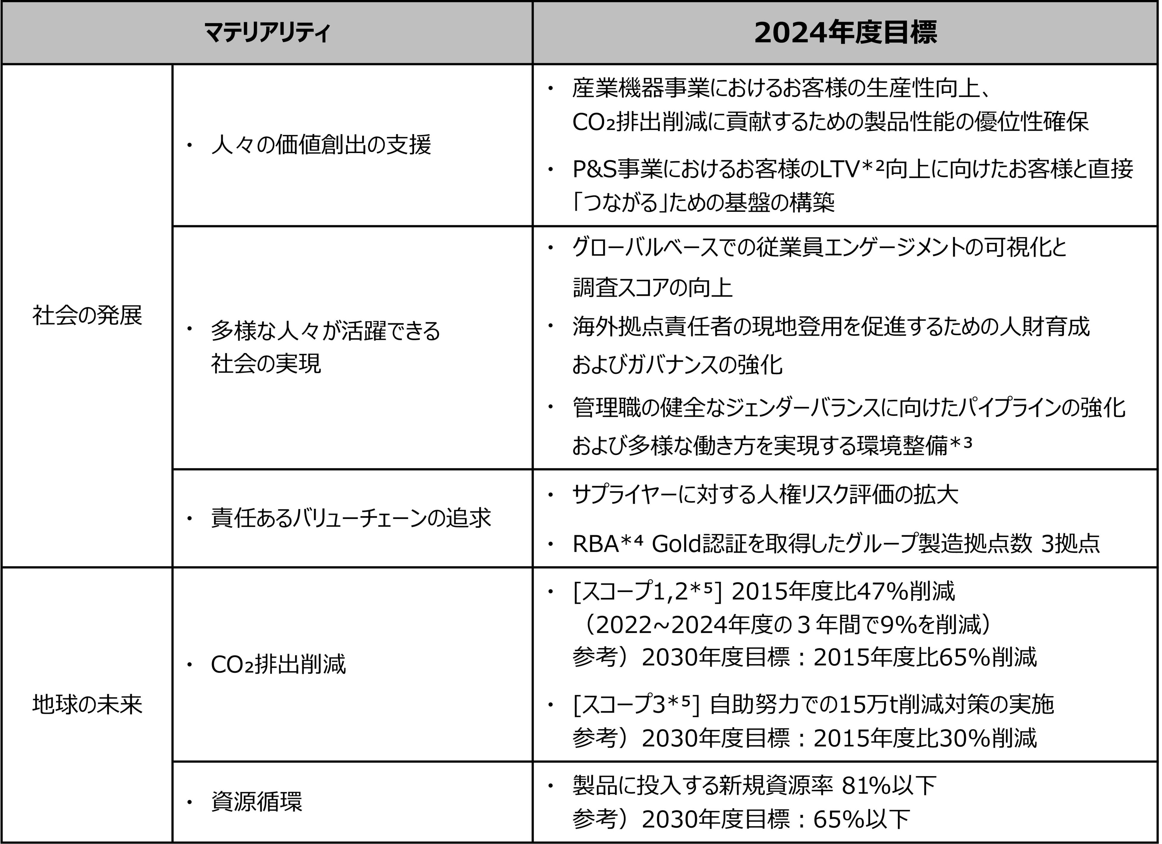 中期戦略「CS B2024」は、「At your side 2030」の実現を見据え、バックキャストで最初の3年間に取り組むテーマを定め、策定された。同時に、ブラザーグループが社会の発展と地球の未来に貢献するため、解決すべき重要な社会課題として5つのマテリアリティを特定し、マテリアリティに関連したサステナビリティ目標が設定された。