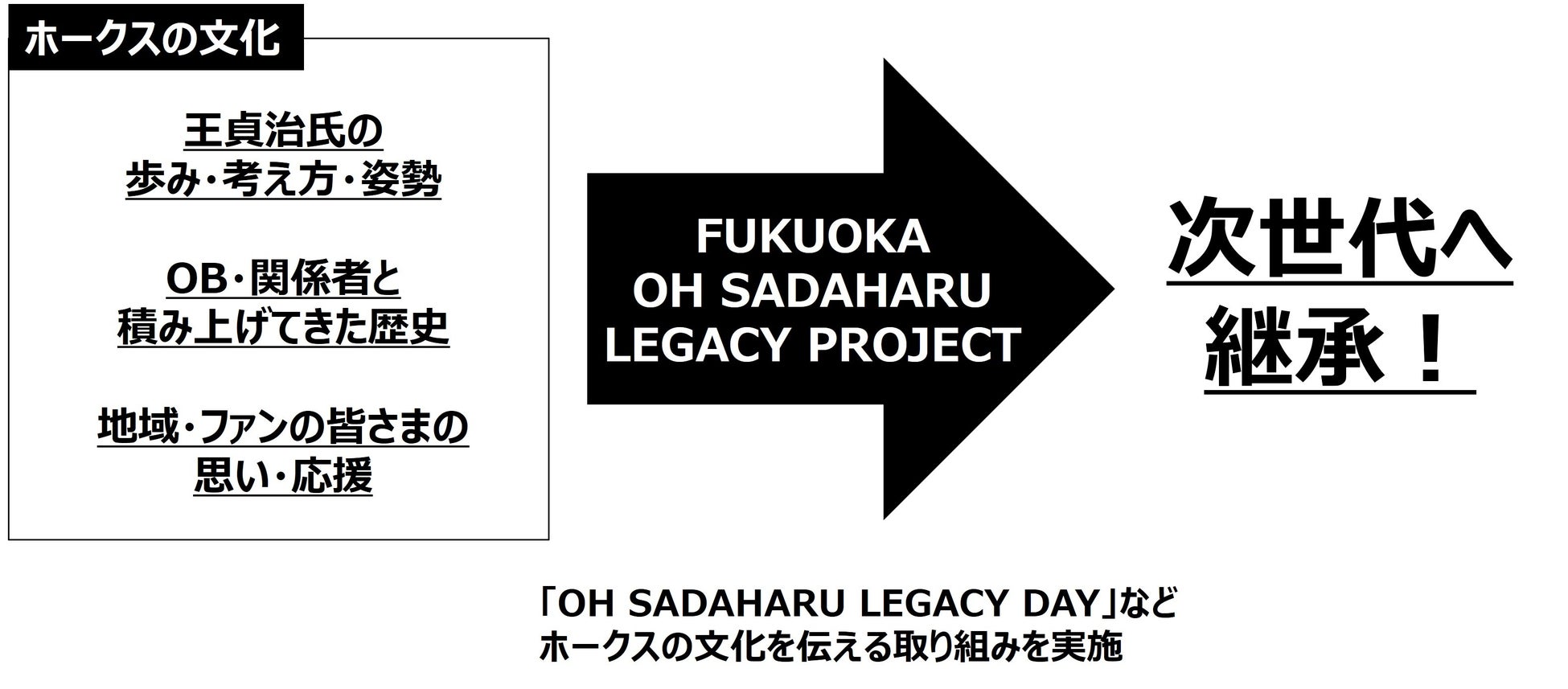 本プロジェクトは、王貞治氏を象徴としながら、その前後で福岡のプロ野球を支えてきた歴代の選手、関係者、さらには地域とともに積み重ねられてきた「ホークスの文化」を、過去の記録や思い出としてとどめるのではなく、次の世代が受け取り、語り継いでいける“地域のレガシー(文化的遺産)”として未来へ手渡す取り組みです。王貞治氏や選手たちが福岡で切り拓いてきた歴史、体現してきた理念を福岡のスポーツの文化として根付かせる活動を行っていきます。