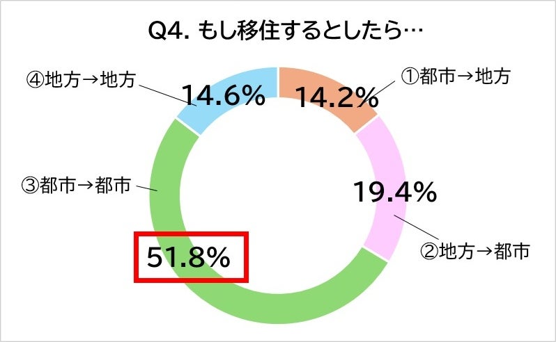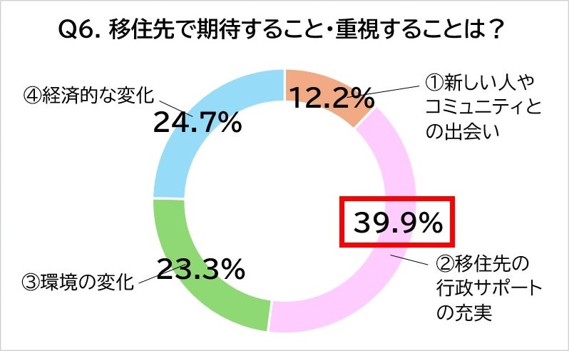 さらに傾向として利便性の良い「都市部から都市部へ」を移住する希望地域として回答される方が約50%と環境の変化(利便性の低下)に消極的である点や、特に【移住先に期待する点・重視する点】については、「行政サポートの充実度」を重視する回答が約40%と高く、また自由記述質問でも「周囲に頼れる人がいないのは心配」や「仕事があるか」、「子育て支援のサポートの有無」など、特に行政面においての移住後の生活基盤について優先度を高く考慮されている方が多いことなども確認できました。