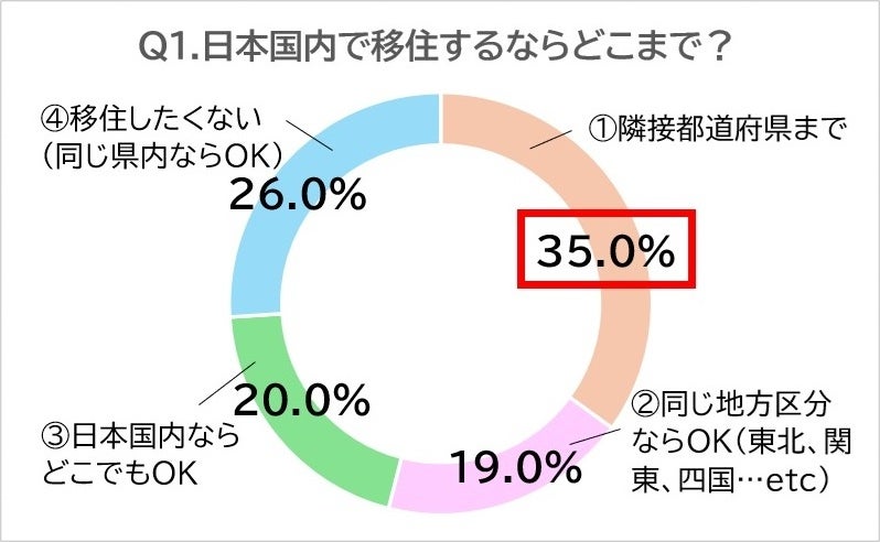 『移住婚について』の意識調査であるため、移住を意識する最大の理由はやはり「結婚」が約40%(次点は仕事が約30%)と多くなることは予想通りでしたが、移住する地域の希望では「日本全国どこでもOK」という回答が約20%と、当初の想定よりも多い結果が見られました。