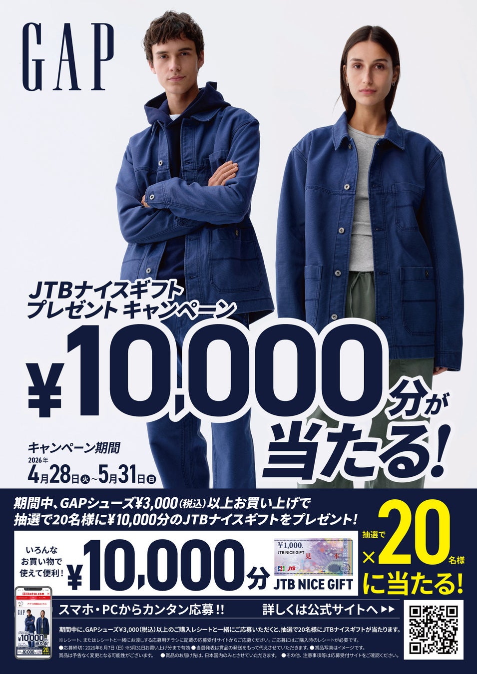 期間中、GAPシューズを3,000円(税込)以上お買い上げいただいた方の中から抽選で20名様に、いろいろなお買い物で使えて便利な「JTBナイスギフト」を10,000円分プレゼントいたします。