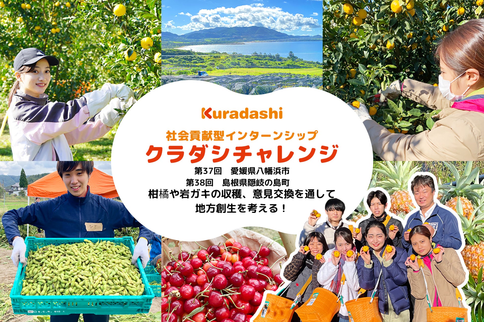 ソーシャルグッドマーケット「Kuradashi」を運営する株式会社クラダシ(本社:東京都品川区、代表取締役社長:関藤竜也、以下「クラダシ」)は、2024年2月に愛媛県八幡浜市、3月に島根県隠岐の島町で開催する社会貢献型インターンシップ「クラダシチャレンジ」の参加学生の募集を開始いたします。八幡浜市では、柑橘(清見・せとか)の収穫・選果・梱包、隠岐の島町では、岩ガキの収穫・箱詰めをはじめ、各地域で事業者・自治体との意見交換や現地観光などを実施する予定です。
