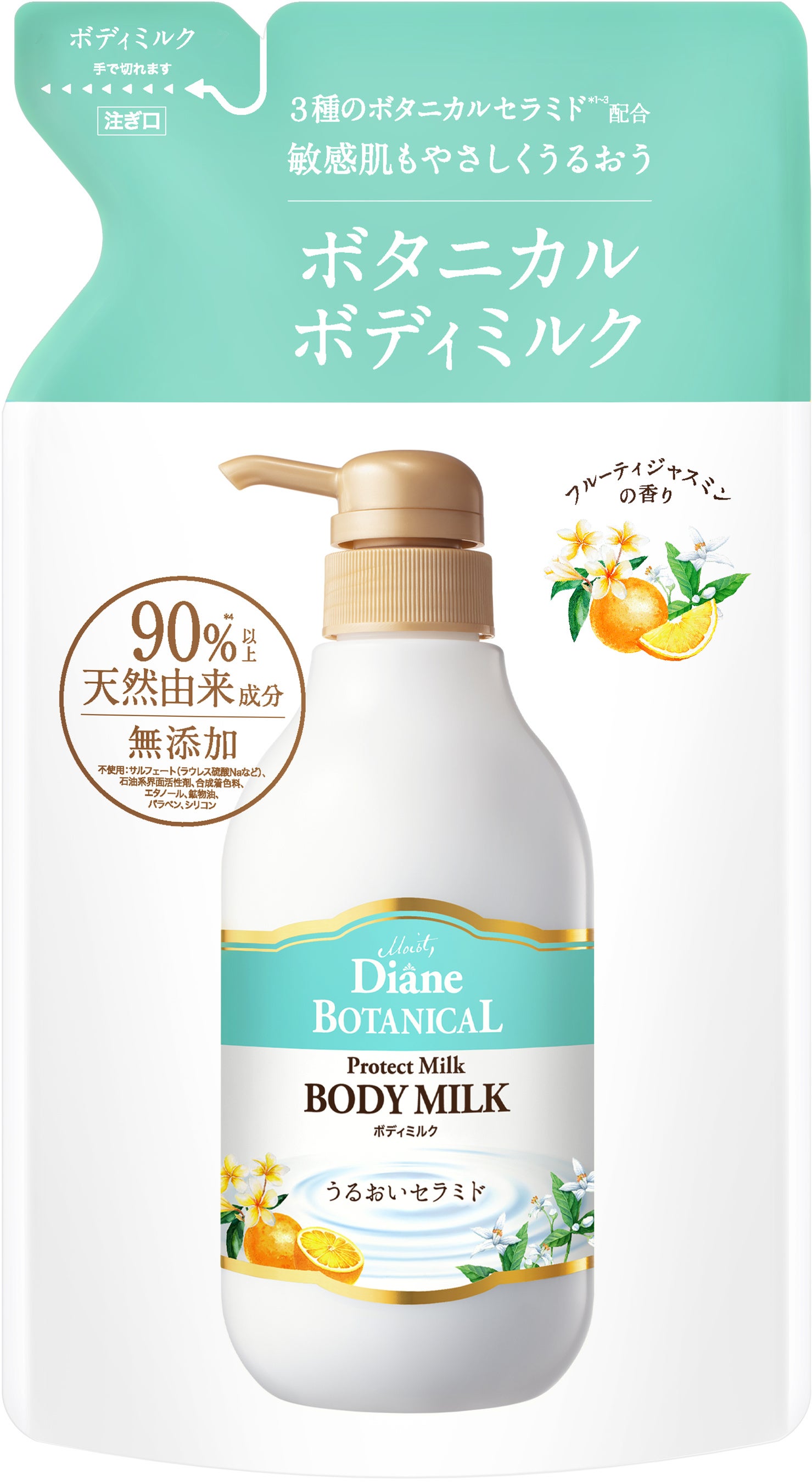 今回は、ダイアンボタニカルの特徴のひとつである10種のオーガニックボタニカルエキスに加えて、桃・ゆず・パインのボタニカルセラミドを配合。天然由来の保湿成分で肌のうるおいを守ります。さらにダイアンボタニカルシリーズの中でもリピーターの多い、フルーティジャスミンの香りを採用しました。
