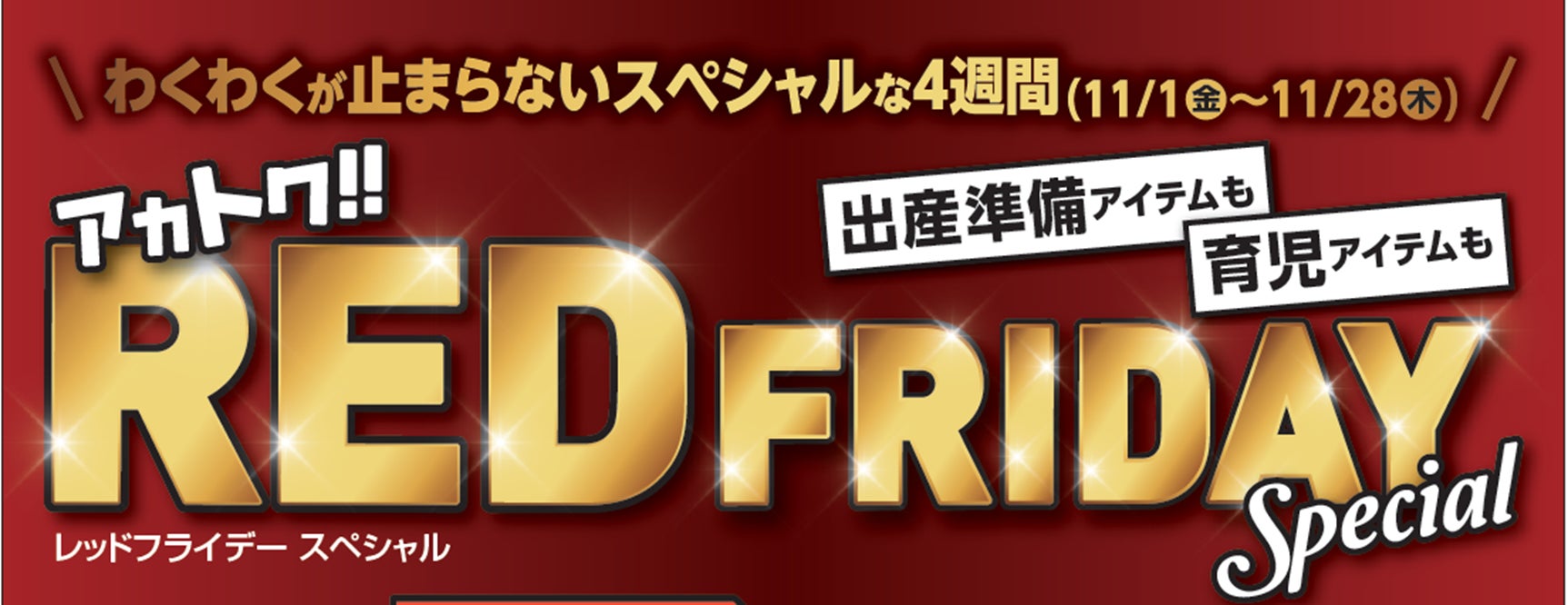 アカチャンホンポでは、ブラックフライデーに代わり『レッドフライデー』としてお買い物を楽しんでいただき、出産準備用品や育児用品など、バイヤーが厳選したイチオシ商品を特別価格でお届けします。