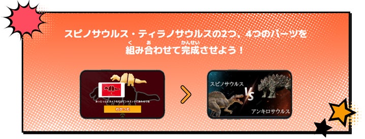 恐竜のお菓子の形を探して、スマートフォンで特設サイト内の専用カメラから読み取ると、読み取った恐竜と、バトル相手の恐竜が画面上に現れ、迫力のあるバトル動画を楽しむことができます。14種類の動画が表示され、組み合わせパーツを探して恐竜を完成させると、より臨場感のあるバトル動画を楽しむことができます。※2024年10月15日(火)11:00 公開予定