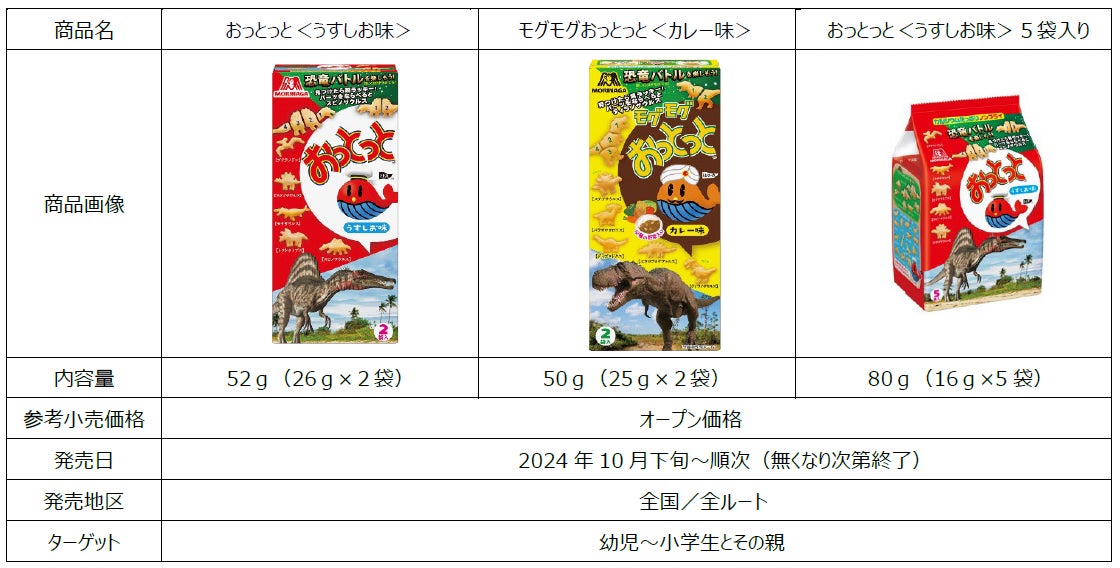 森永製菓株式会社(東京都港区芝浦、代表取締役社長・太田 栄二郎)は、ノンフライ製法で仕上げたスナック菓子「おっとっと」シリーズより、「恐竜」の菓子型を収録した「おっとっと<うすしお味>」「モグモグおっとっと<カレー味>」を24年10月下旬より順次、期間限定で発売します。さらに、恐竜のお菓子の形を探して、スマートフォンで特設サイト内の専用カメラから読み取ると、読み取った恐竜が臨場感のあるバトルを繰り広げる動画を楽しめるブラウザコンテンツを2024年10月15日(火)に公開します。親子やお友達とともに食べても探してもお楽しみいただける「おっとっと」でスナック市場を盛り上げるとともにお客様に笑顔を提供してまいります。