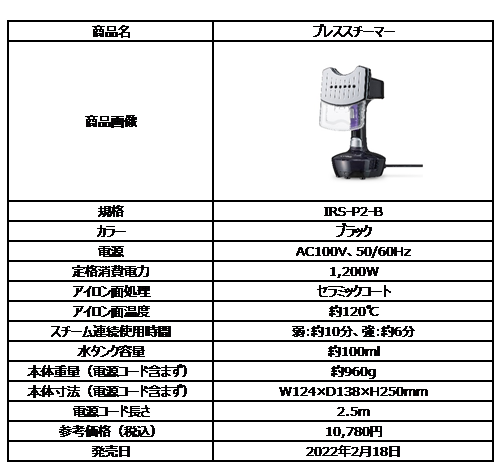 アイリスオーヤマ株式会社(本社:仙台市、代表取締役社長:大山 晃弘)は、ヘッド部分の2枚のプレートでズボンを挟んでプレスする「ズボンプレッサー機能」を搭載した「プレススチーマー」を、2022年2月18日より全国のホームセンターやインターネットサイトを中心に販売します。