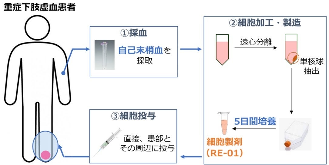 RE-01は、田中教授らの研究グループが開発した培養法を用いて作成される自己末梢血培養単核球細胞群です。血管内皮前駆細胞をはじめとする機能的な再生細胞を多く含んでいるため、血管新生・再生作用により微小血管を増やすことで組織中の血流量を増加させるだけでなく、抗炎症作用や創傷治癒を促す作用をもつことが確認されています。これらの複合的な作用により、炎症と虚血に起因する創傷を治癒することが期待され、血管炎による微小循環障害により生じるバージャー病、膠原病患者の難治性下肢潰瘍に対する新たな治療方法となりうると考えられています。また、患者に対する侵襲を100-200 mlの採血に留め、培養は培地交換や継代(*9)を行わず短期間で製造できるため、低侵襲・低コスト・高効果な血管・組織再生治療として期待されます。