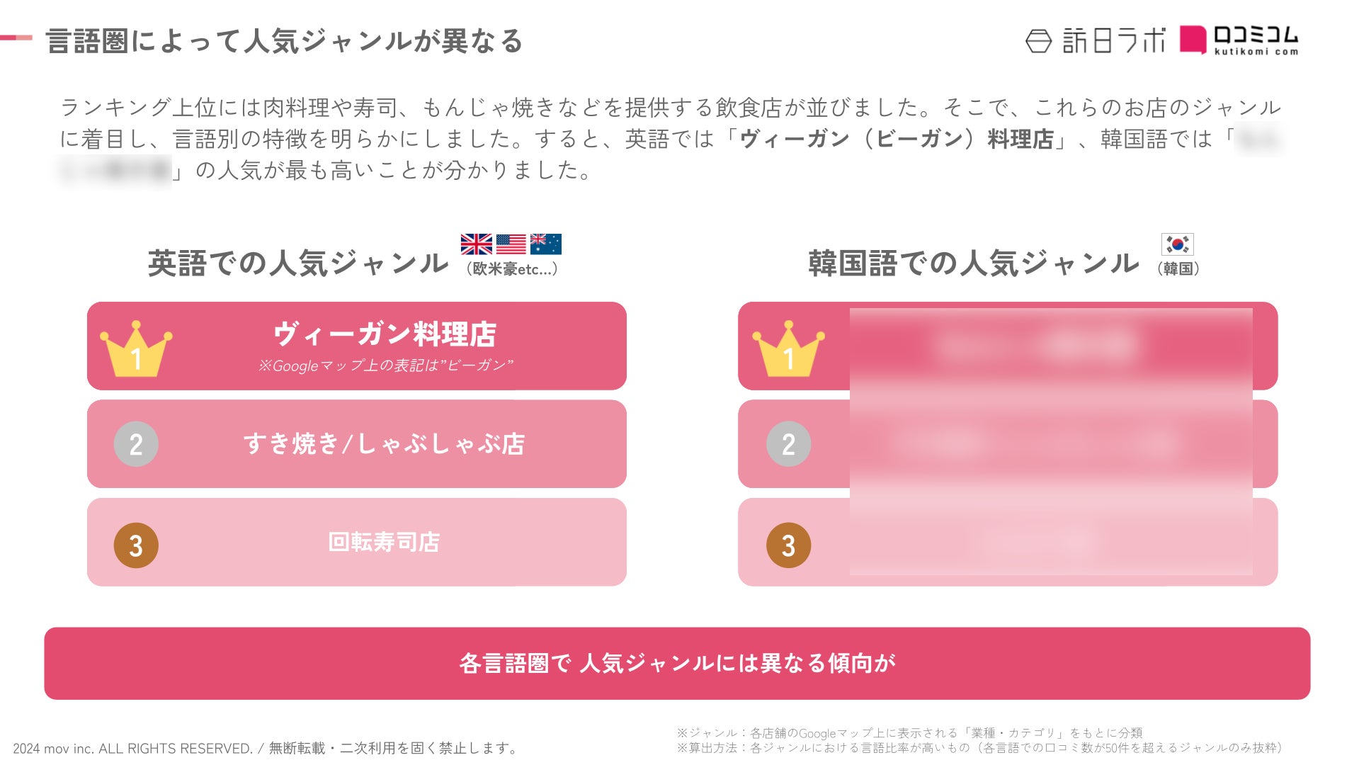 飲食店のジャンルに着目してみると、英語では「ヴィーガン料理店(※Googleマップ上の表記は”ビーガン”)」、韓国語では「◯◯◯◯◯◯◯」の人気が最も高いことが分かりました。