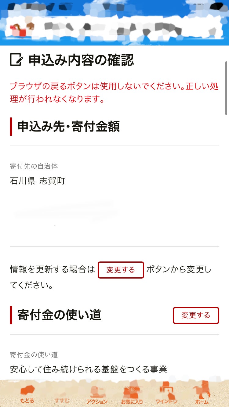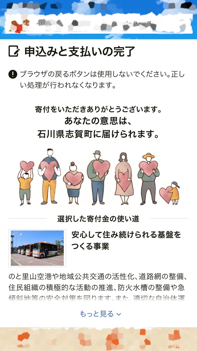 ・寄付先; 震度7に直面された石川県志賀町のふるさと納税(https://www.furusato-tax.jp/city/product/17384)返礼品なし・「安心して住み続けられる基盤をつくる事業」(防災関連使途指定)