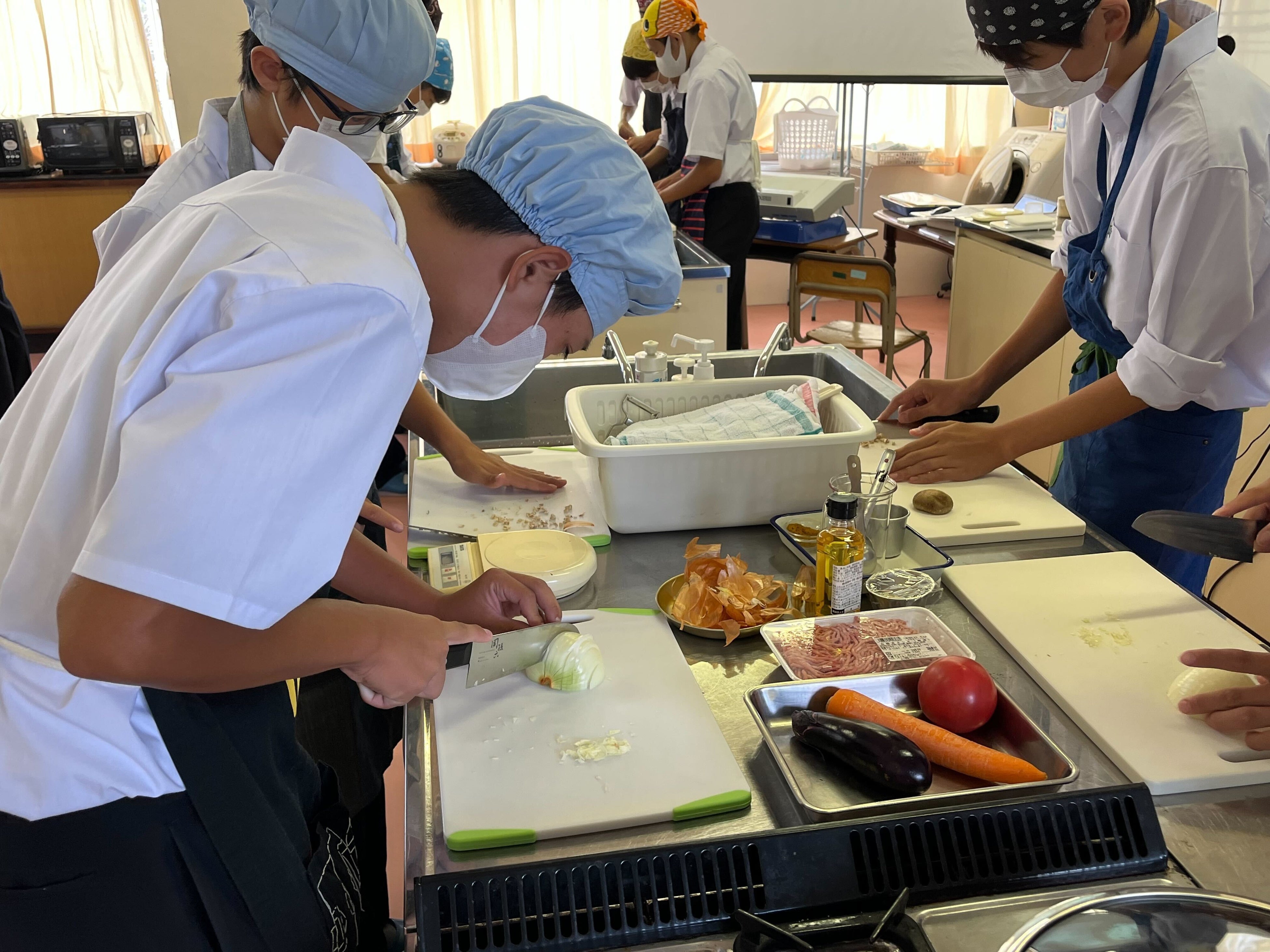 いよいよ調理体験がスタート! まずは、今日使用する野菜すべての重さを計るところからはじまりました。その後、レシピの説明と島本先生の切り方のお手本をもとにやさしい切りかたを意識し、しいたけ、なす、トマト、ニンジンとカレーに必要な野菜を切っていきます。しいたけの切り方を学んでいる時には、軸の部分も食べられることと手でほぐしてから切ることなど、学んだ各野菜のやさしい切りかたを活用してみじん切りに挑戦。 「今日学んだことをぜひおうちで実践したり、家族の方にも伝えて欲しい。」という島本先生のメッセージを受け取った生徒の皆さんは、調理班の仲間と協力し楽しみながら調理を進めていました。島本先生が各班へまわってアドバイスを行った際には、生徒さんから島本先生へ疑問点を質問する一面も。包丁が使い慣れない生徒さんには慣れている班メンバーがサポートしたり、過剰除去を少しでも減らすべく、自ら考え野菜を切るなど、とても積極的に調理体験を行っていました。
