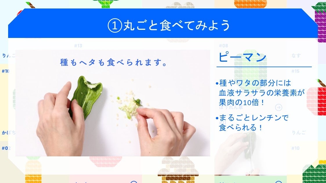 今回の特別授業の講師としてお招きした、ラク家事アドバイザー/料理研究家の島本美由紀先生監修。先生のエコ・食品保存に関するご知見のもと、キャベツやにんじん、ブロッコリー、たまねぎといった野菜を丸ごと美味しく食べられる切り方を動画などでご紹介しています。ついつい過剰に切ったり、剥いたりしてしまう皮や茎の部分も、ムダなく美味しく食べてもらうことを目的としています。