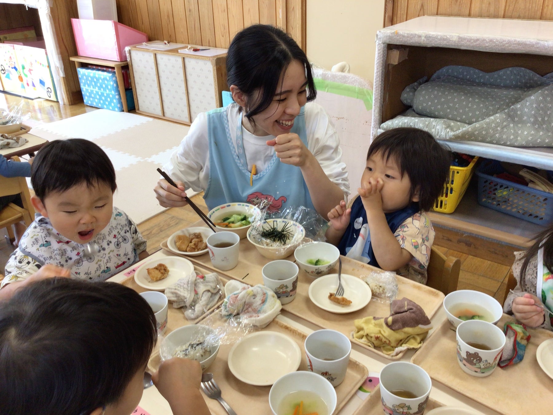 保育士の特権である、自園調理の給食やおやつを一緒に食べる機会も!
