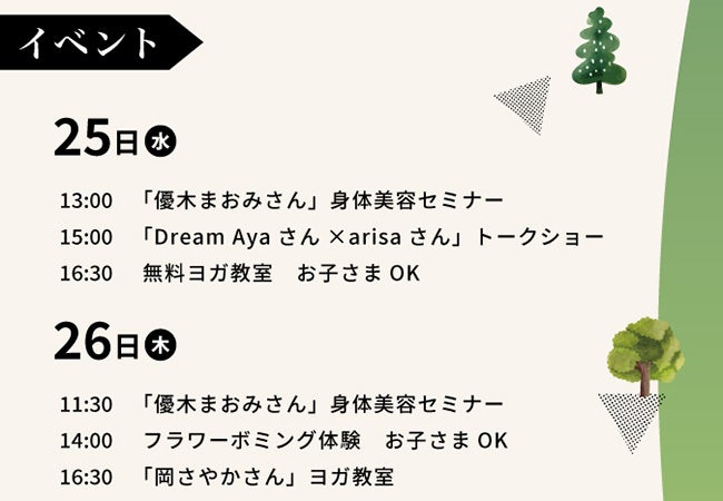 「優木まおみさん」身体美容セミナー、「Dream Ayaさん×arisaさん」トークショー、お子様も参加できるフラワーボミング体験、ヨガ教室など