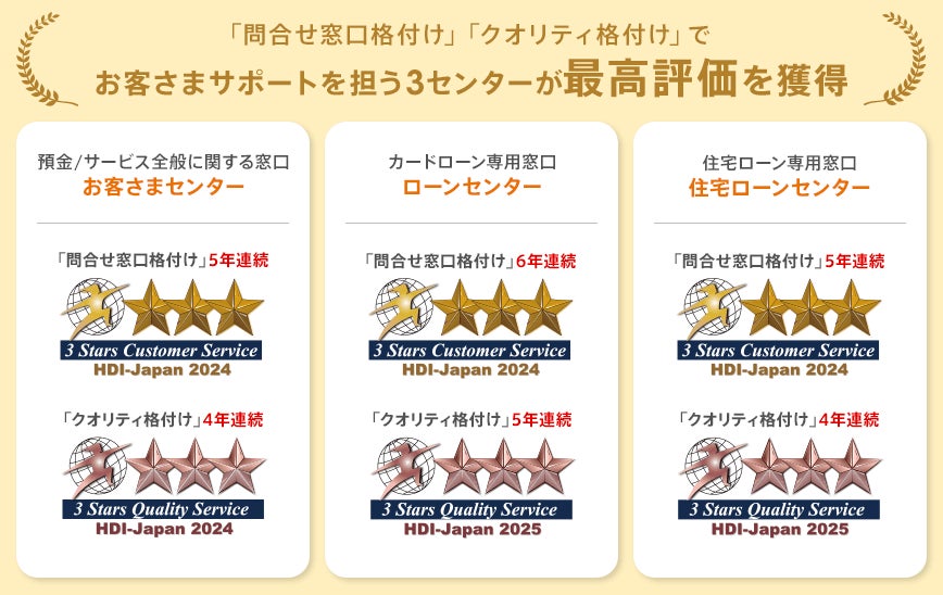 「問合せ窓口格付け」については、カードローン専門窓口である「ローンセンター」が今回の受賞で 6年連続、預金/サービス全般に関する窓口である「お客さまセンター」と、住宅ローン専門窓口である「住宅ローンセンター」が5年連続で三つ星を獲得しました。