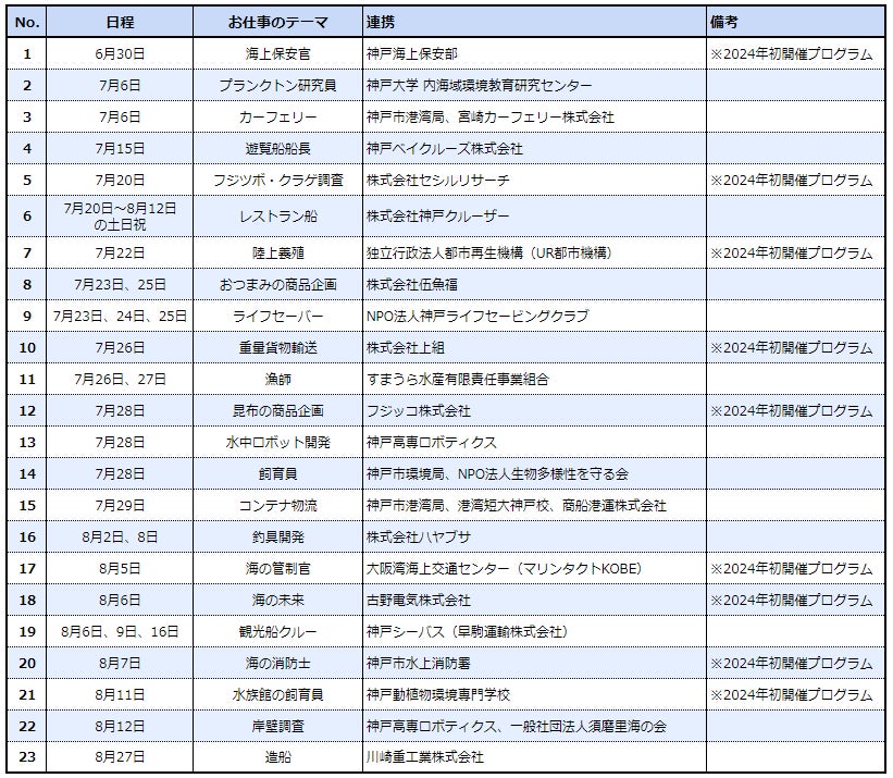 今年は、子どもたちの夏休みにあわせて7月20日(土)~8月12日(月・祝)の期間を中心に、神戸市内&近郊でプログラムを開催し、新たに『海上保安官』『海の管制官』『海の消防士』といった海の安全を守るお仕事をはじめ、『重量貨物輸送』『陸上養殖』のお仕事など、他ではなかなか体験することのできない職種も加わり、子どもたちや地域の方々に“海洋都市神戸”の幅広い海の仕事を知ってもらう独自の取り組みとして更なる拡充を果たしました。地域・産業が一帯となって神戸の海洋産業を盛り上げ、子どもたちの成長を応援する取り組みとして今後も展開していきます。