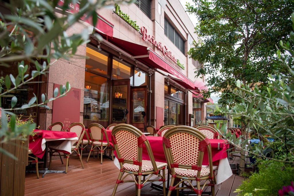 ●都会の喧騒を忘れるほど緑豊かで解放感あふれるトラットリア。