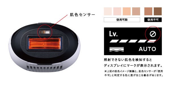 使用できない濃さの肌色を検知すると、光を照射できないようにする肌色センサーを搭載。肌がデリケートなVIOゾーンにも使用できます。照射できない肌色を検知するとディスプレイにマークが表示されます。
