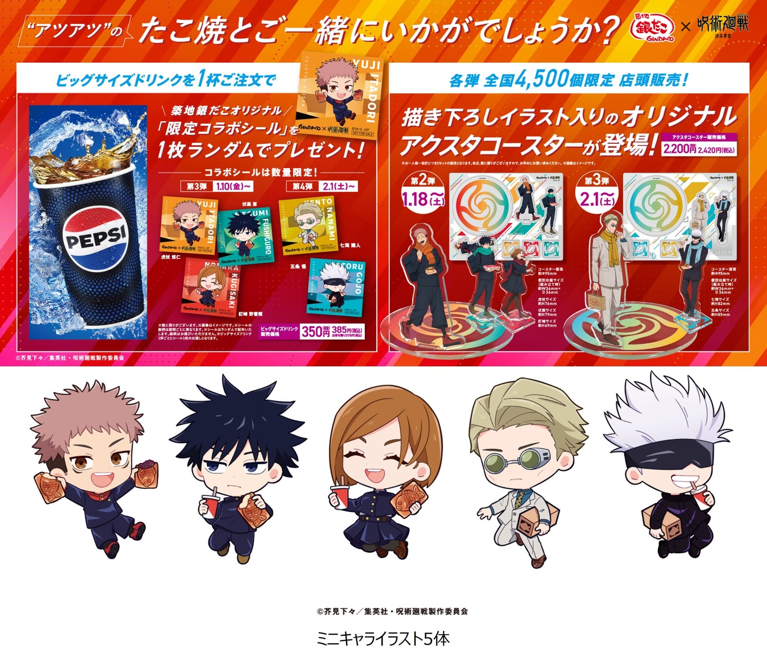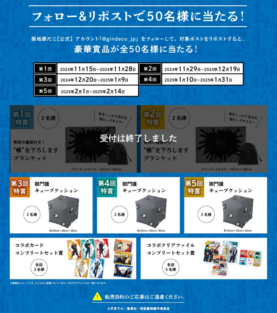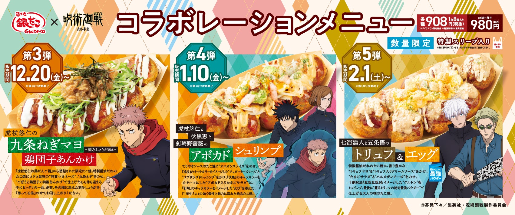 国内外に 「築地銀だこ」https://www.gindaco.com/ を展開する株式会社ホットランド https://hotland.co.jp/ (本社:東京都中央区、代表取締役社長:佐瀬守男)は、2024年11月15日(金)から2025年2月14日(金)までの期間、全国の築地銀だこ店舗( 一部店舗を除く)にて、TVアニメ 『呪術廻戦』 2期 「懐玉・玉折 / 渋谷事変」 とのコラボレーションを実施中。12月20日(金)より、後半戦の 「渋谷事変」コラボレーションがスタートいたします!